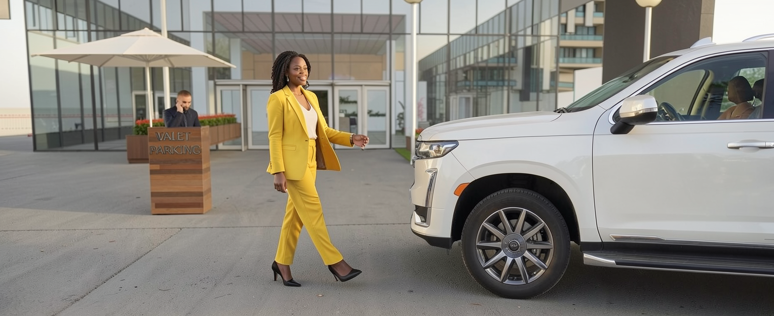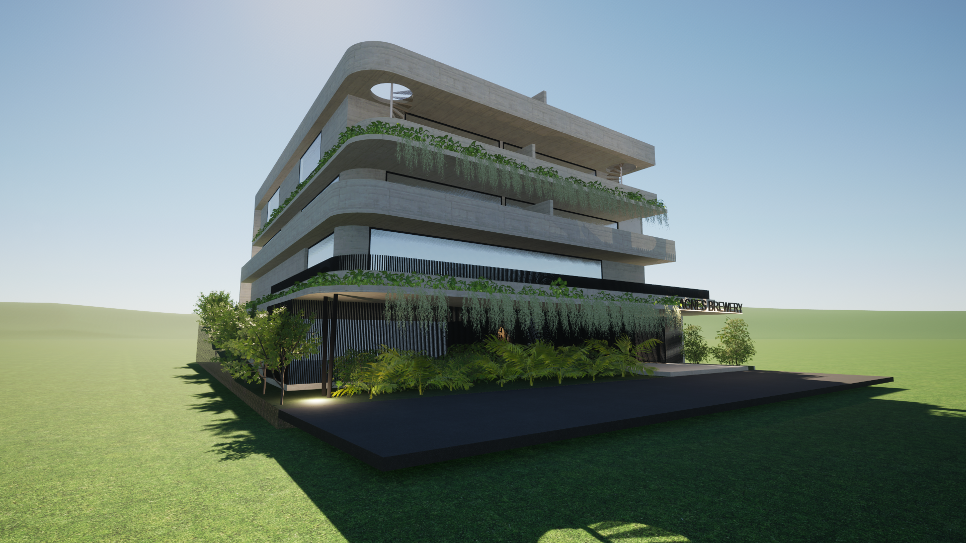 make photo realistic with afternoon sky and lush planting on all sides have a luxery car on the road with its headlights on