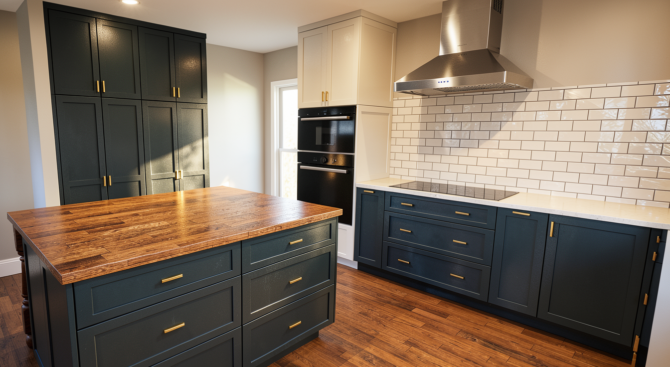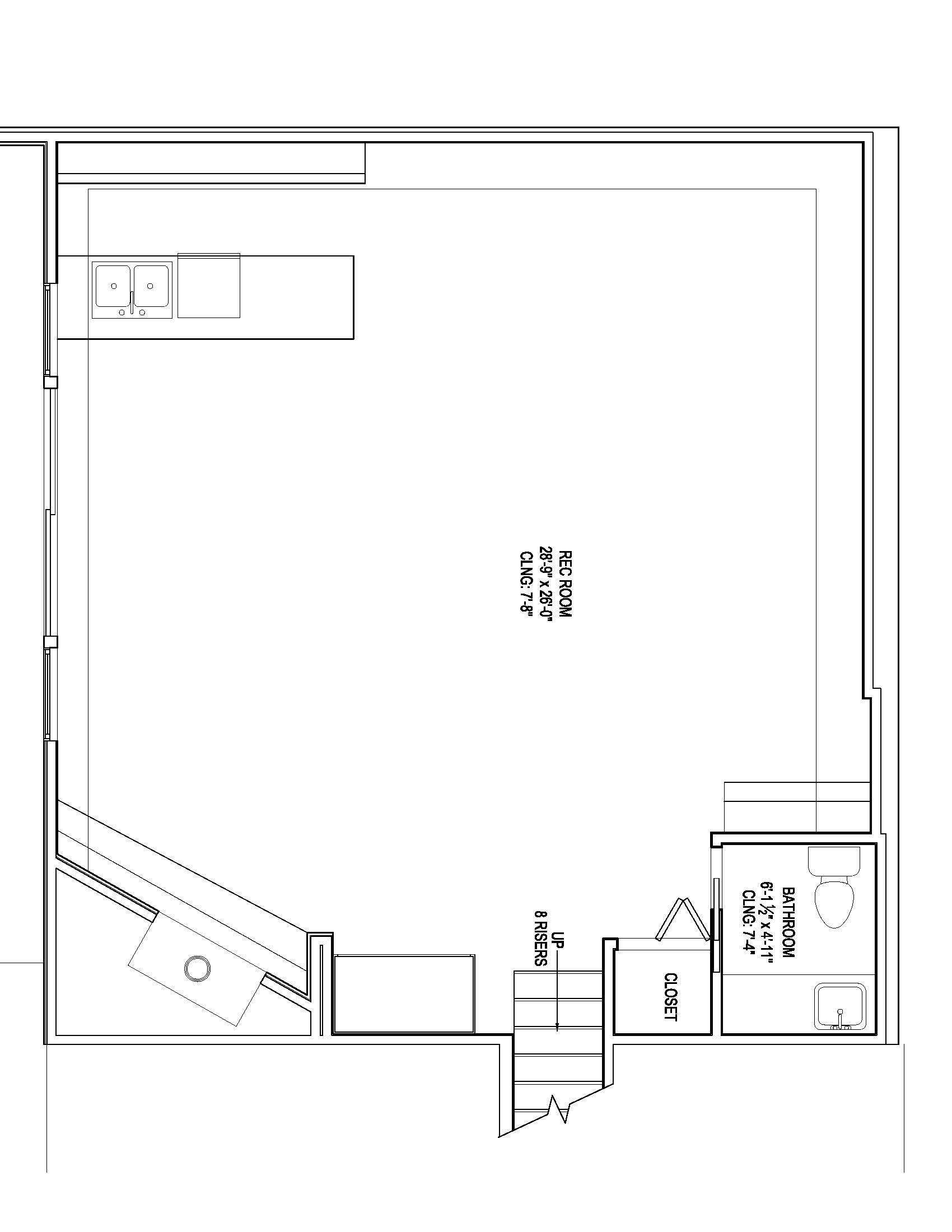 render this rec room floor plan to be a 1950 s inspired tiki bar accent color is orange add totem pole tiki bar stools add pool table floors are terrazzo wood paneled walls copper bar top less tiki stuff on the walls add sliding door and stone fireplace with seating area