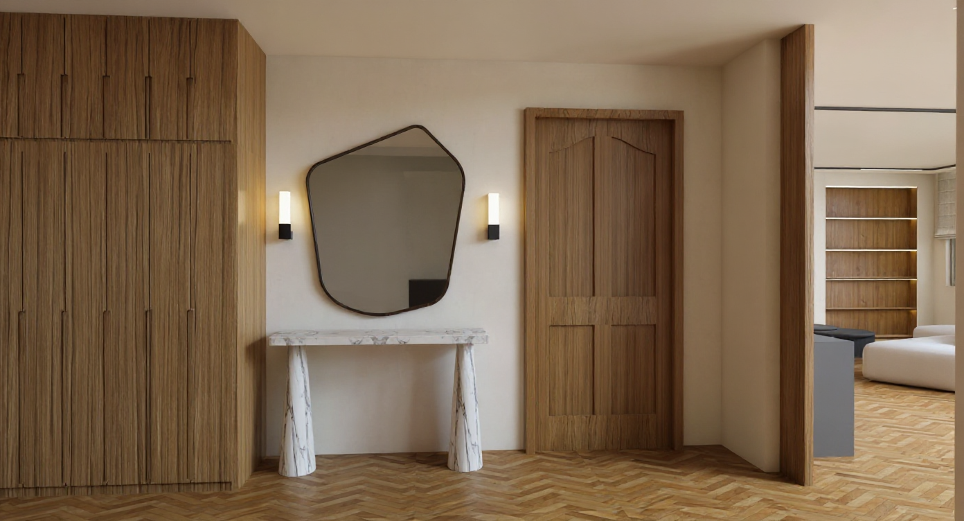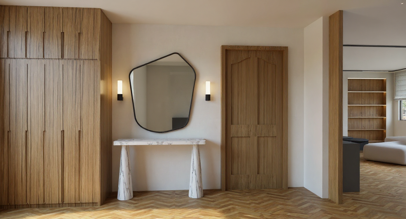 small modern scandinavian lounge area urban lounge interior area with an industrial aesthetic three sculptural lounge chair wooden designer coffee table green plant wall a neon sign on the wall that says coffee time and a rug statement pendant with warm light dark neutral tones balanced with green plants