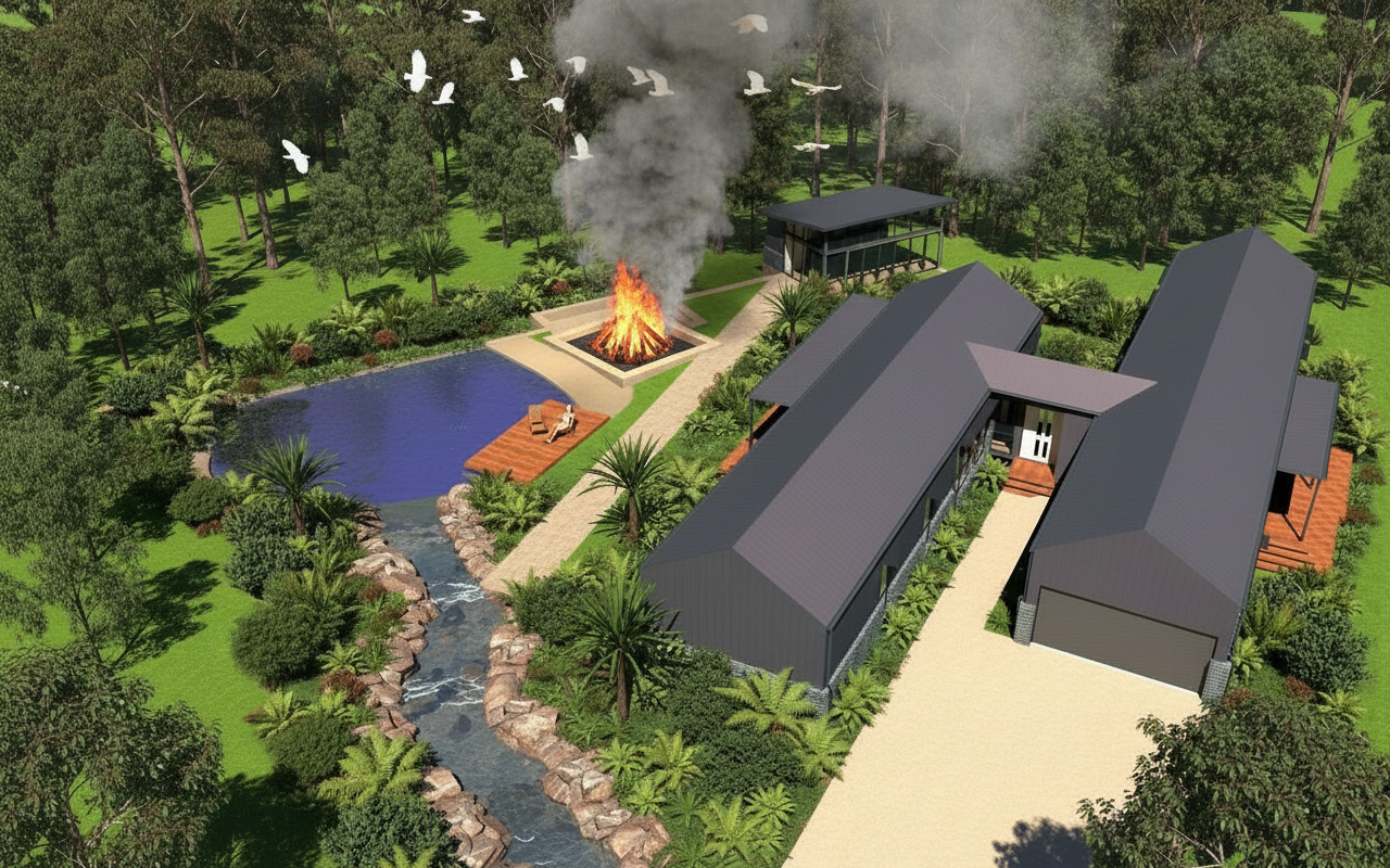 generate a serene architectural render featuring two buildings with timber cladding and large glass windows surround them moved lawn and strategically placed clusters of trees incorporate a tranquil pond in the foreground to the left of the image with its blue water reflecting the sky and paddleboarders on the pond add pathways with vibrant flowerbeds create a warm golden sunset glow to enhance the peaceful atmosphere casting soft shadows across the scene
