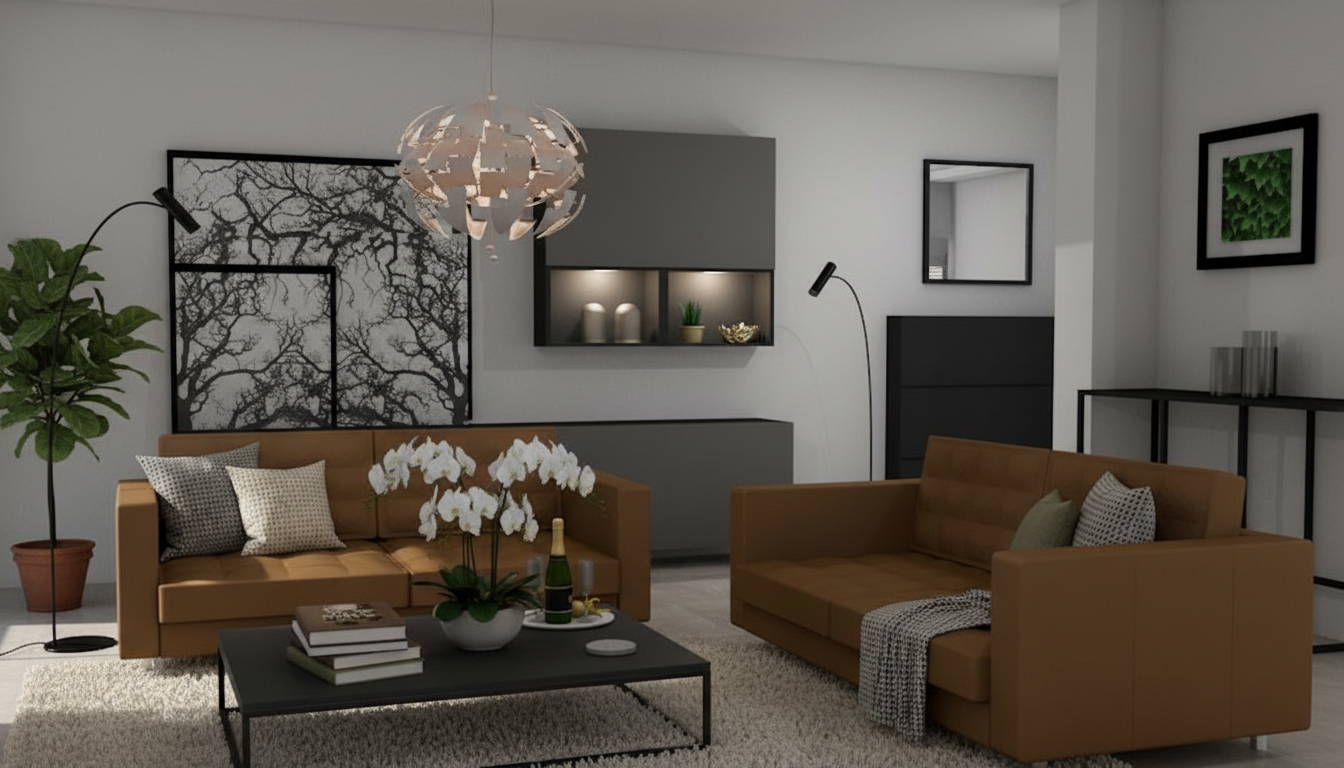 turn this cabinetry drawing into a rendering with white oak light stained cabinets like this https georgecabinetry com blog white oak kitchen cabinets use black knobs for door hardware light white quartz countertops and a white zelige square tile backsplash add a fridge and change the range hood fan into a flat white hood facade have the view out the windows looking out onto a front yard into a community with lots of grass
