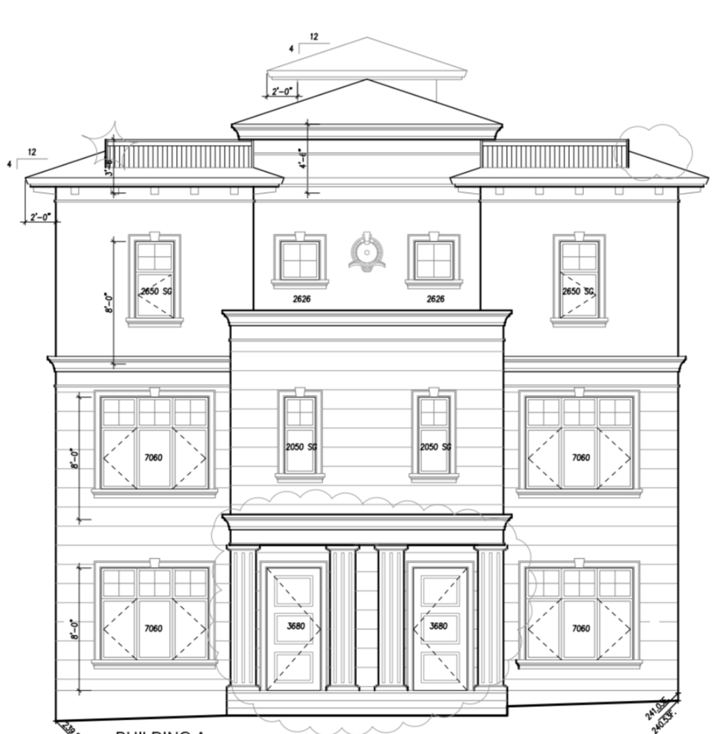 turn this elevation to realistic rendering with dark grey window and white sand stone exterior below the crown mouldings and white stucco above the crown mouldings