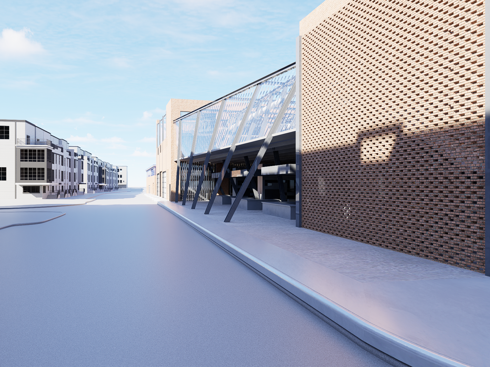 make realistic the glass connecting the two brick buildings is a greenhouse and has crops there are two trees in front of the brick screen to the right the metal booths on the first floor below the greenhouse are food market booths no people this is located in alexandria virginia and make the sky look more realistic do not change view