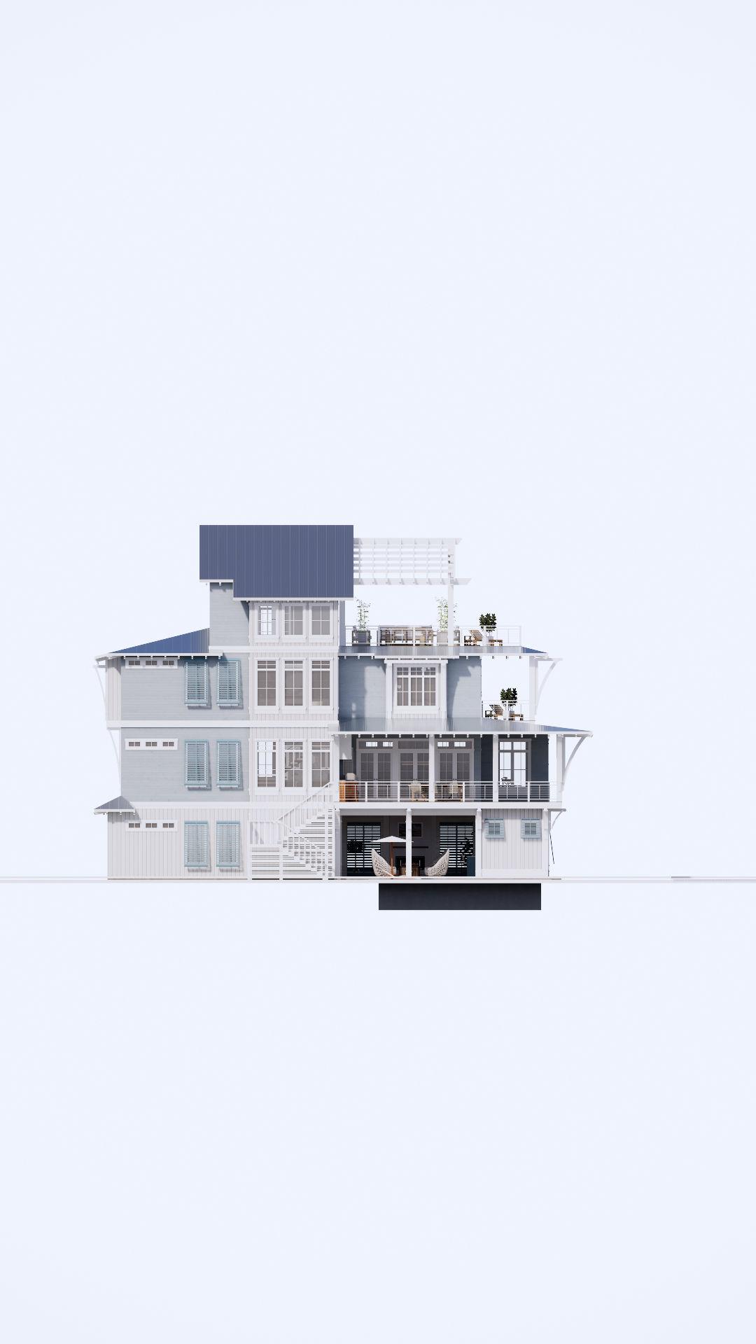 you are a professional image renderer you create the highest grade renderings around and specialize in architectural renderings this is the left elevation of a beach house create a high resolution photorealistic image of this structure keep the windows as they are where they are keep the doors as they are where they are keep the main structure as it is where it is keep the roofline as it is where is it do not add anything to the structure that i have not asked for the roof is standing seam metal galvalume the background will be a coastal shoreline it should be early afternoon with a bright sunny day clear skies the landscaping should be late summer and should be that of a luxury beach estate
