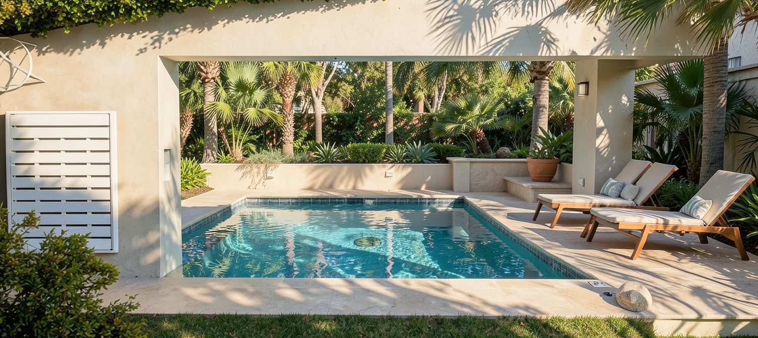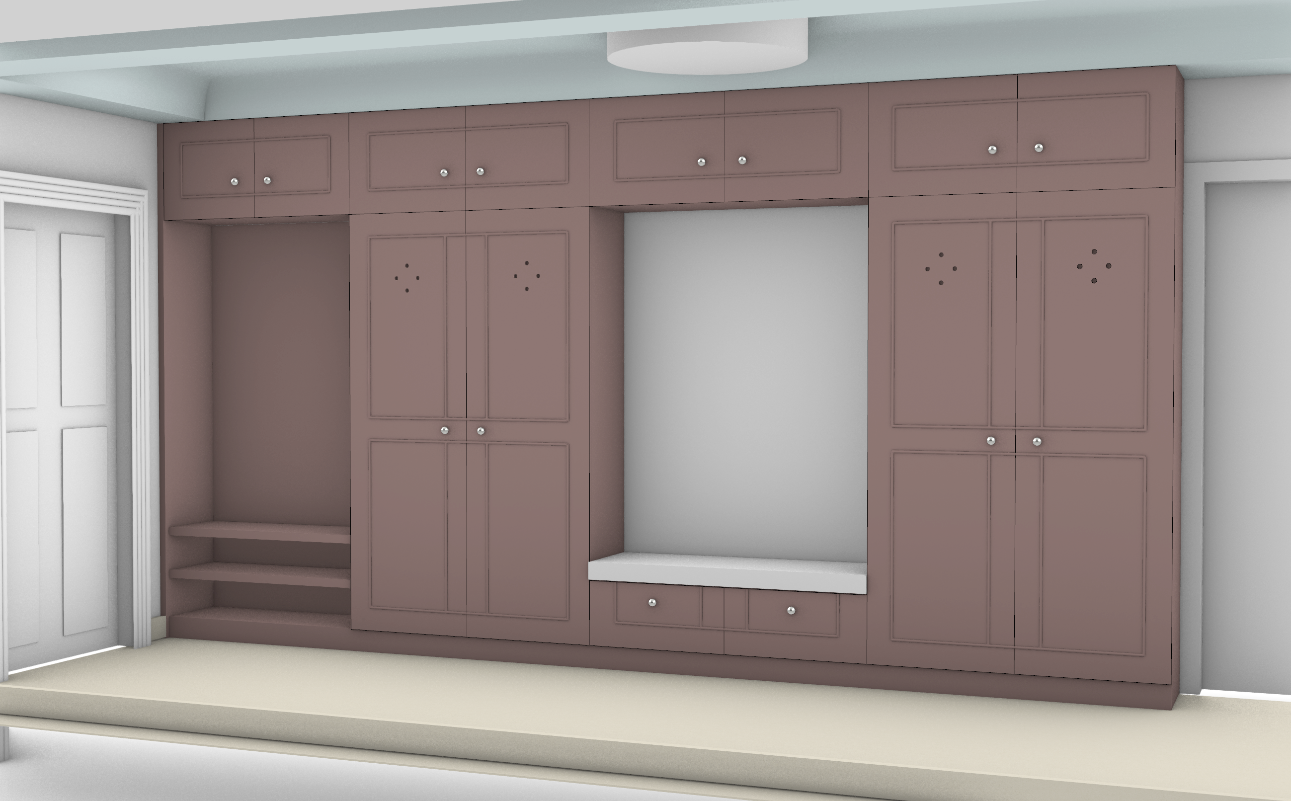 render this room in a romantic morning light coming in from the garden make the cabinets a matte dark brown cherry warm stained wood with visible grain the trim on the cubby doors are a thin half round detail and the ceiling above a pastel blue make the floors a matte brown brick in a grid pattern the back of the nook should be plaster with an abstract landscape painting in it the cushion in the nook should be a modern stripe the front door on the left can be a craftsman style antique door painted off white
