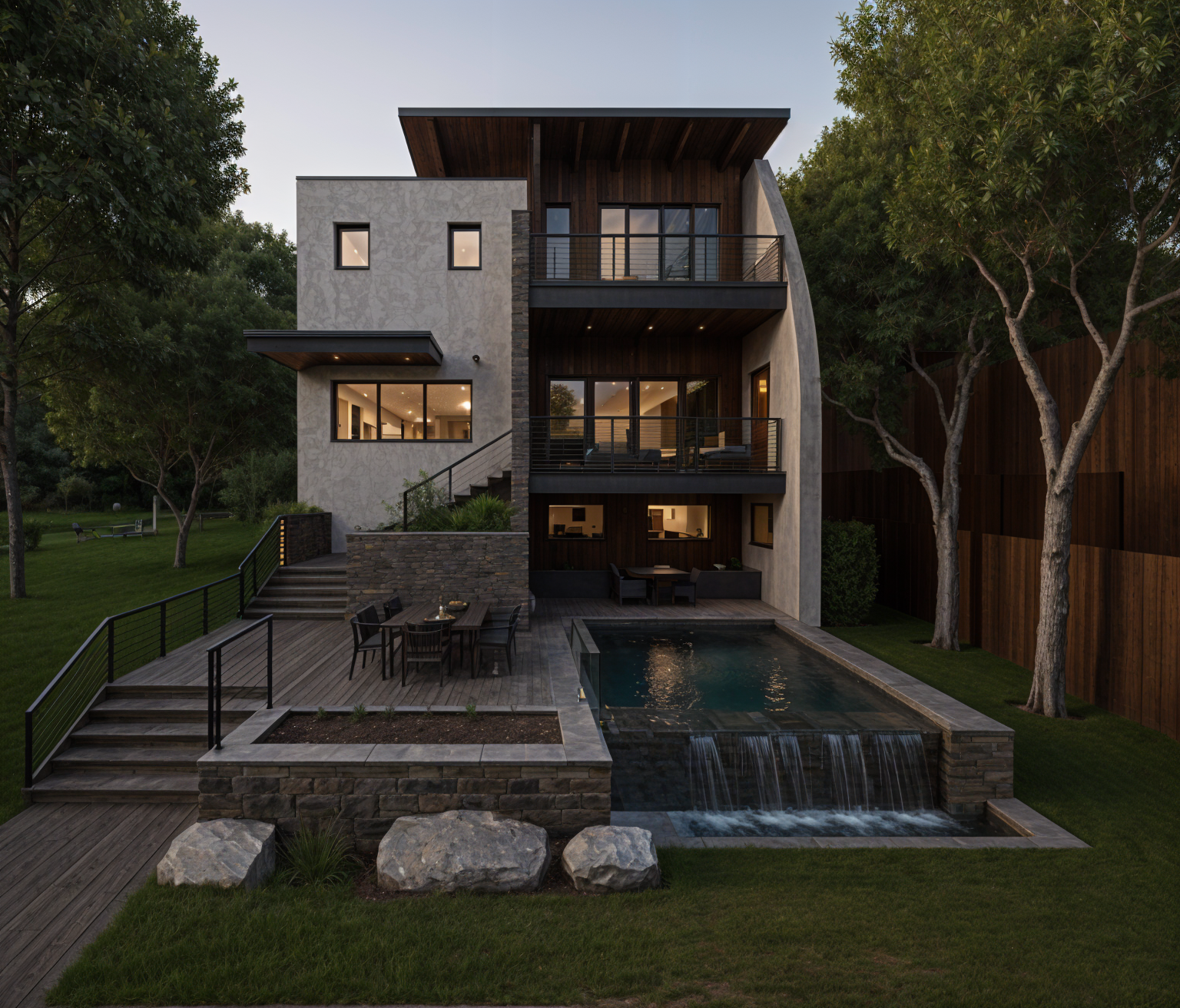 create a photorealistic rendering of a modern single story home with a low pitched roof and clerestory windows the exterior design should feature a balanced combination of natural stone horizontal wood siding and dark modern paneling highlight the large windows framed in dark trim a glass paneled garage door and a modern entry door with horizontal glass inserts include neatly landscaped greenery with shrubs flowering plants and trimmed grass along the front of the house the driveway should be concrete connecting seamlessly to the sidewalk and street render the scene in clear daylight with a bright blue sky soft white clouds and natural shadows cast across the home and landscape to enhance realism architecture