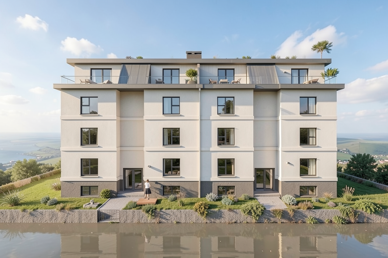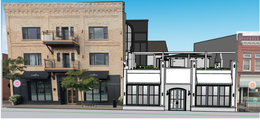 use the provided street elevation rendering as the base image and composition transform the image into a highly photorealistic architectural rendering similar in realism and lighting to a professional exterior real estate photograph like the reference image of the red house maintain the exact architecture proportions storefront windows doors balconies fa ade details rooflines and neighboring buildings from the original rendering the final image should look like a real photograph of the building on the street environment ground plane replace the foreground with a clean urban sidewalk directly in front of the storefronts include realistic concrete sidewalk slabs subtle seams and texture in the concrete curb edge along the street no grass gardens or landscaping in front of the stores simple urban streetscape appropriate for a downtown main street lighting mood use warm late afternoon sunlight similar to the reference house photo soft golden light natural shadows from buildings and street elements realistic reflections in storefront glass balanced contrast like a professional architectural photograph materials render materials ultra realistic natural brick texture matte black metal storefront frames glass reflections subtle weathering and depth in materials realistic balcony railings and metal finishes street context keep the existing buildings on either side and match their lighting and perspective so everything blends naturally into the street scene optionally include a few subtle pedestrians light street activity minimal street furniture style references photorealistic architectural rendering real estate photography lighting v ray style realism architectural visualization ultra realistic materials natural sunlight camera straight on street elevation perspective eye level architectural photography 50mm lens look output high resolution ultra detailed photorealistic