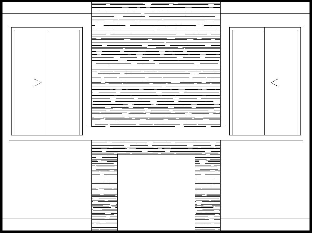 interior elevation of a traditional farmhouse style fireplace with stacked arizona stone rustic barn wood beam lintel dunn edwards cool december white painted walls white painted crown and base molding walnut plank flooring with abundant natural light entering through the windows with white window frames lush vegetation outside