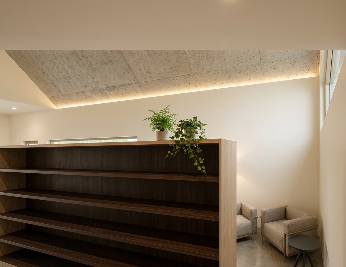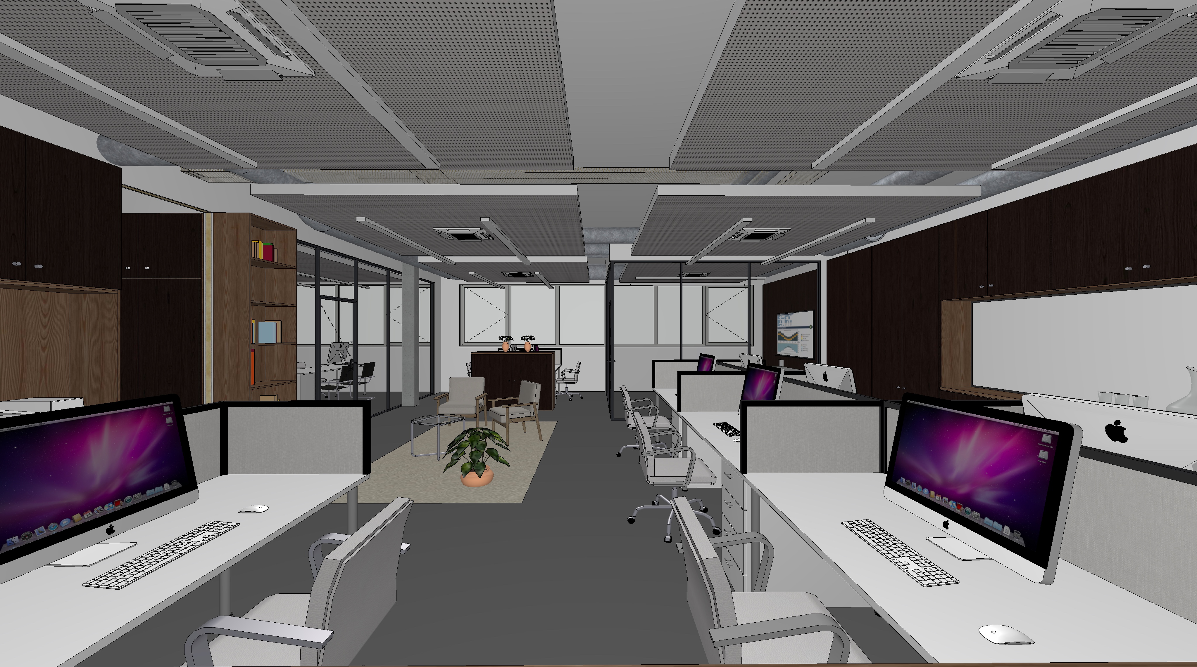 professional photorealistic office interior rendering modern open space workplace with dark walnut wood furniture and light wood accents perforated white plasterboard suspended ceiling suspended linear led lights with visible hanging cables exposed hvac ducts industrial style glass walled meeting rooms imac workstations cozy waiting area with beige armchairs potted plants in terracota pots dark gray matte epoxy resin flooring bright and clear atmosphere high key lighting abundant natural daylight from large windows architectural visualization high end corporate office design ultra detailed 8k resolution photorealistic materials realistic shadows and reflections professional interior photography style depth of field ambient occlusion global illumination