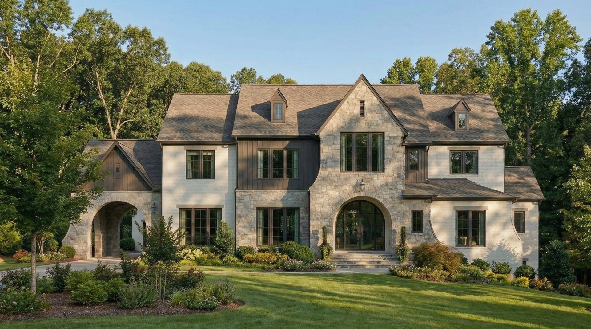 do not change any structure or element of this rendering only change the dark siding to a lighter taupe