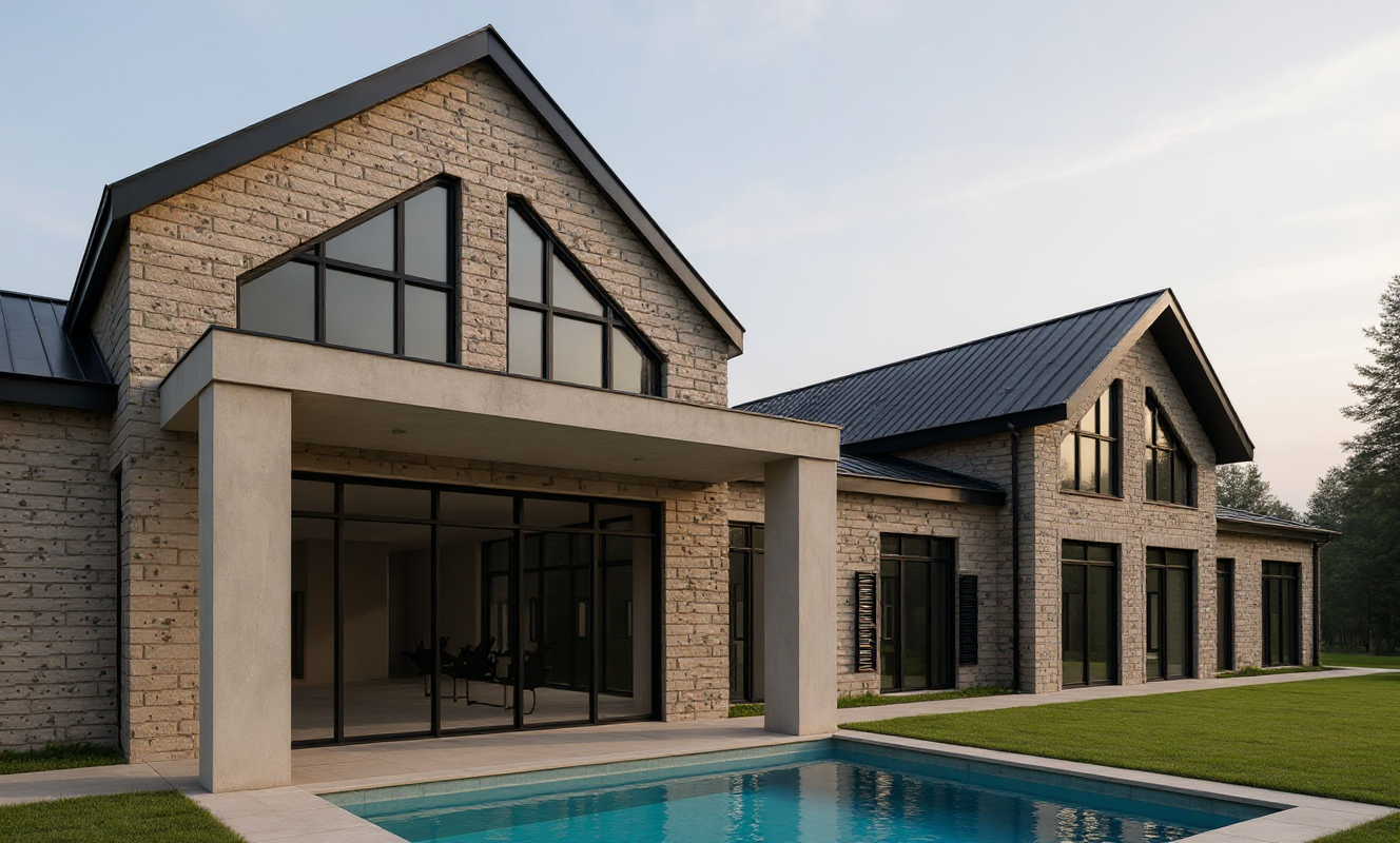 modern exterior shot a transitional home is an architectural and interior design style that blends traditional classic elements with modern aesthetics aiming for a comfortable sophisticated and timeless look that is neither overly ornate nor starkly minimalist key characteristics include a neutral color palette with pops of accent color clean lines balanced with some curves minimal decoration and the use of quality materials transitional homes are known for their balance creating a universally appealing and serene environment o establish a strong street presence with a sense of gravitas o transitional style o distinguishing stonework selective use of stone maybe on one or two exterior walls o gable roofs o goal is to have a beautiful dynamic interesting exterior o covered front porch with columns architecture