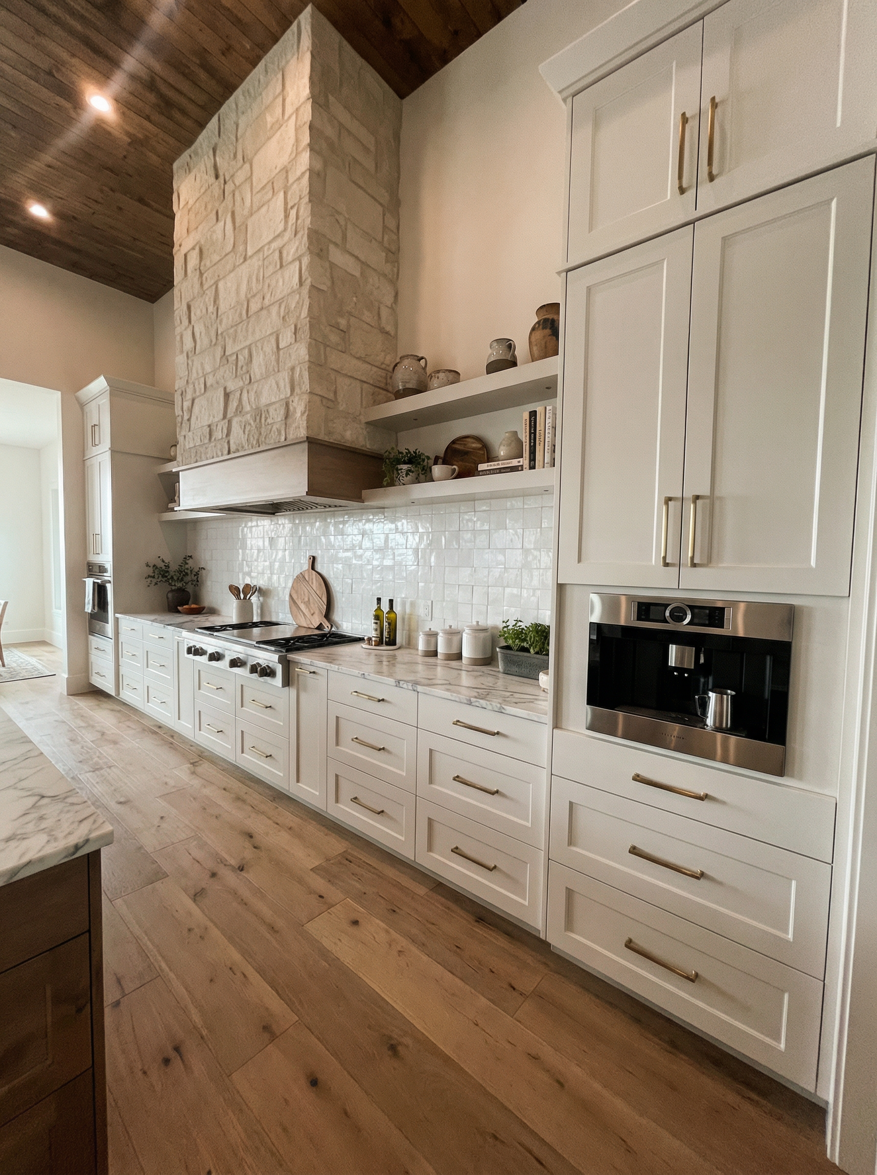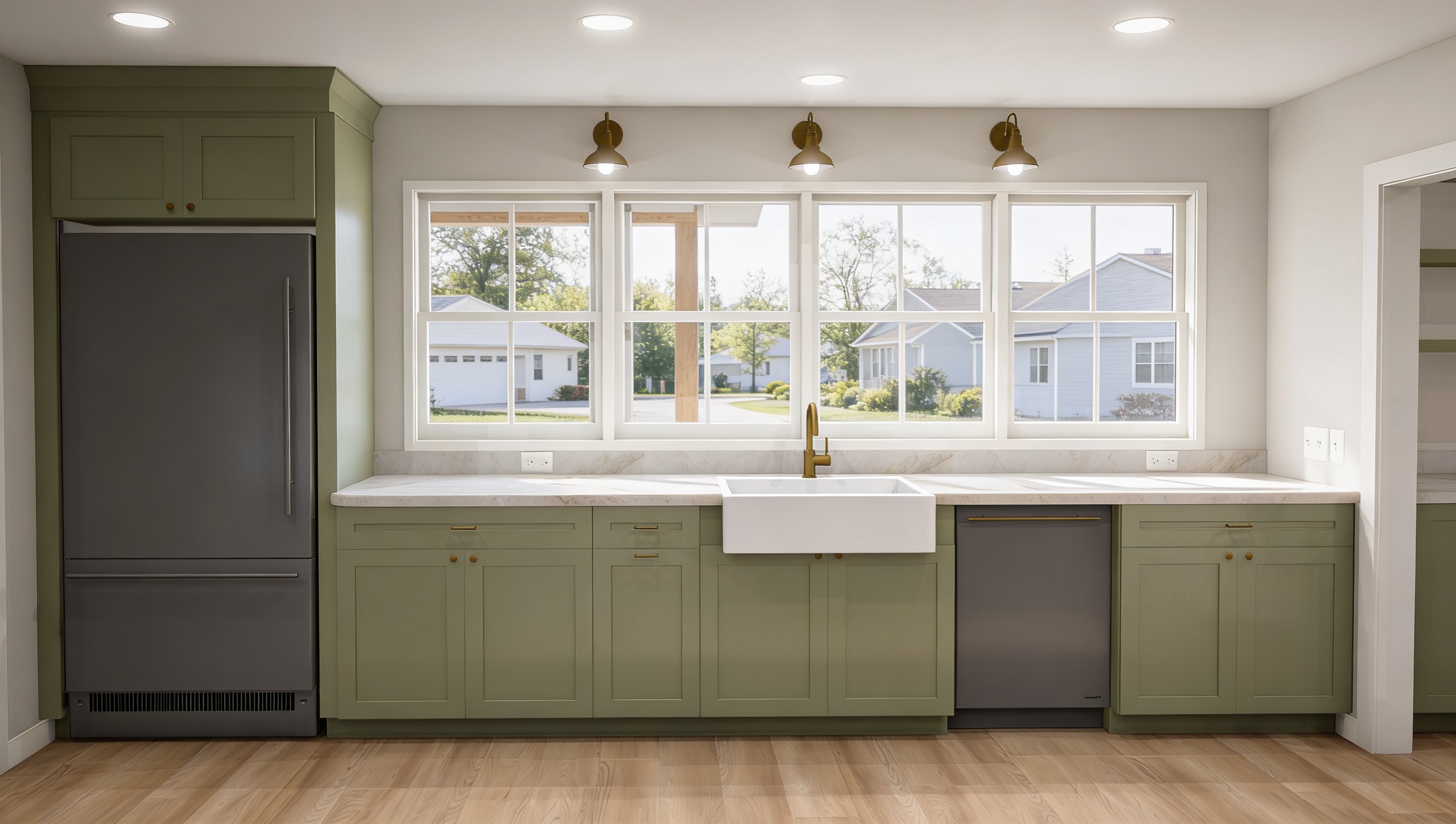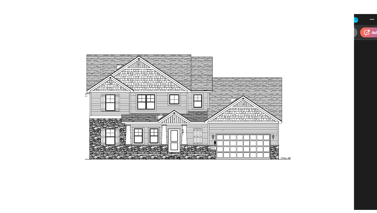 make as photorealistic as possible while keeping textures the same as selection professional landscaping in a lightly wooded scene with good lighting white siding black shingle roof black windows to match plan black front door white garage door no porch railing