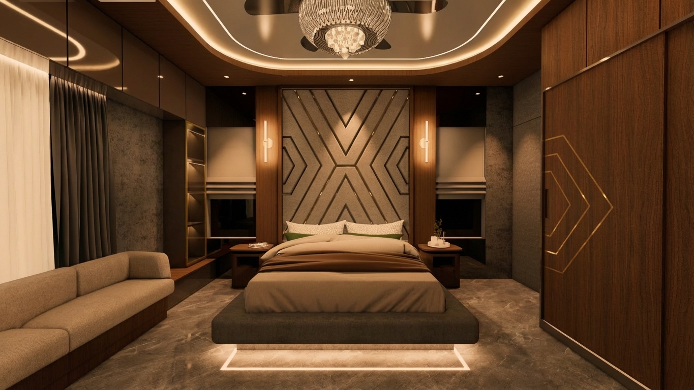 make changes in colors if required to the room with the color pallete walnut wood medium and dark grey beige and brass metal and let the room look dark but cozy and make it look realistic and leave the seater color as it is and also make the headboard and headboard fabric and grooves make it look realistic