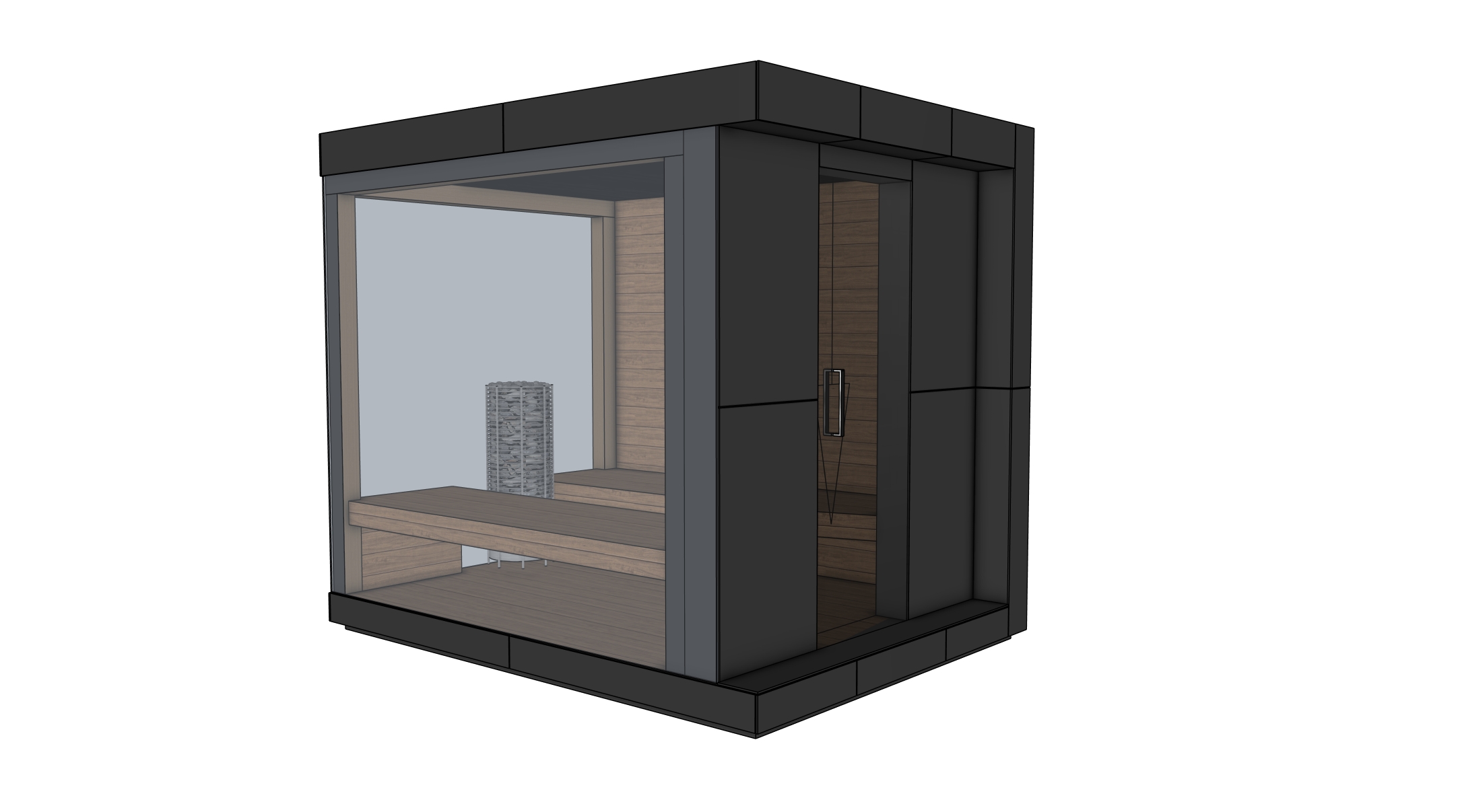 use the attached sketchup whitebox model as the exact geometry reference keep the sauna shape proportions openings panel layout bench layout glass positions door position roof module plinth base and overall design exactly as shown do not redesign simplify stylize or add any elements that are not present in the reference model create a photorealistic premium product render of this modern outdoor sauna as an isolated object with no environment no landscaping no house no sky no people no props no decorative accessories and no background scene use a clean neutral studio style background or plain light grey backdrop only the sauna must be the only subject important geometry design rules front glass wall and left side glass wall opposite the entrance door are full height glazing from the top edge of the plinth base all the way to the underside top edge of the roof module these glass surfaces are fully flush with the exterior facade plane for a very modern minimal look keep the exact panel divisions and gaps as modeled entrance door stays in the exact same position and size as in the reference only two benches both on the same level parallel to each other with a clear passage between them no backrests no extra shelves no headrests no additional wall features no decor absolutely do not add any elements that do not exist in the reference model exterior facade material fundermax compact panels color deep black matte finish smooth premium elegant non reflective matte surface visible shadow gaps between panels exactly 5 mm clearly readable as drawn on the model sharp precise architectural detailing overall look minimal monolithic very modern high end architectural object glazing front and left side glazing full height as described above glass color strongly grey tinted modern premium architectural glass flush with facade surface subtle realistic reflections only not mirror like do not make the glass too transparent interior brushed thermo alder horizontal board layout board width exactly 120 mm warm medium brown tone refined premium wood texture not rustic same material on walls ceiling and benches benches same brushed thermo alder material only two simple benches in one level clean minimal geometry exactly as modeled no backrests and no added details heater harvia cilindro black placed as shown in the reference realistic black cylindrical heater with sauna stones controls add a modern digital touch display next to the entrance door slim elegant integrated premium look lighting very subtle warm led lighting under the benches very subtle warm led lighting along the inner ceiling perimeter very dim floating led under the lower outer edge of the plinth base lighting must stay elegant minimal and understated not bright or dramatic render style photorealistic premium architectural product visualization clean studio presentation soft controlled lighting crisp detail no cinematic environment mood focus on material realism modern proportions and minimal luxury camera use a clean three quarter front view similar to the reference angle keep the object fully visible do not crop important parts do not change the geometry or proportions through lens distortion final critical instruction follow the reference model exactly improve only materials glazing lighting and realism do not invent reinterpret or add anything that is not explicitly shown in the model