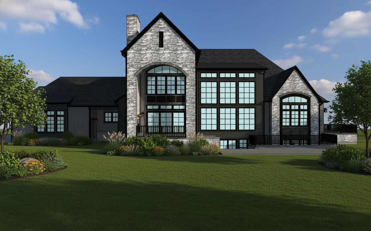 modernist exterior shot photo realistic modern spanish ivory stucco natural stone bronze windows deck architecture