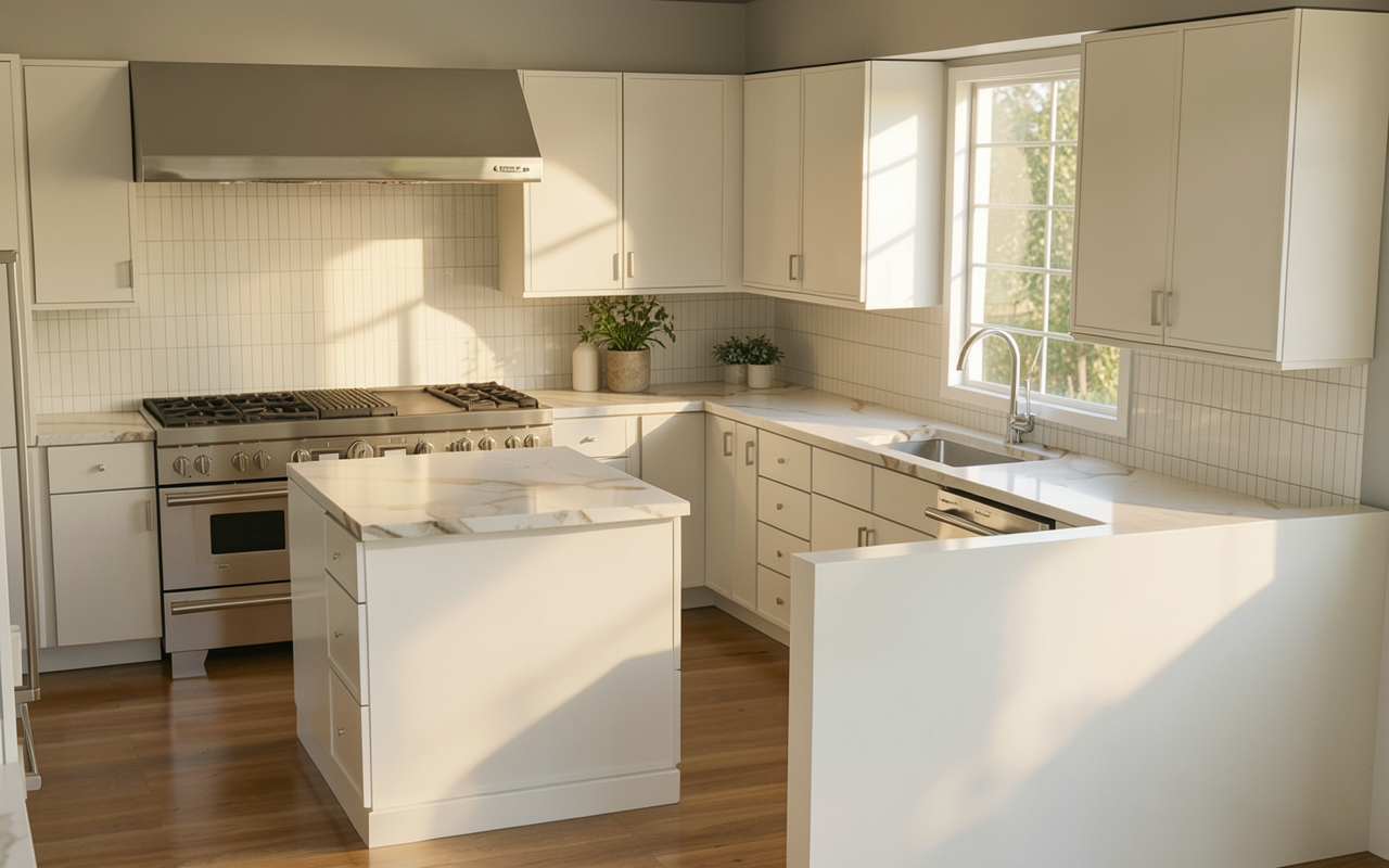 a modern two story house with a minimalist spanish style design the exterior walls are painted in crisp white complementing the sleek white window frames the roof is clad in terracotta tile adding warmth and texture surround the house with lush green grass and a neatly paved driveway made of light gray cobblestones the sky above is a clear azure blue with soft fluffy white clouds adding a serene touch the atmosphere is peaceful and inviting evoking a sense of tranquility and modern elegance tropical luxurious landscape
