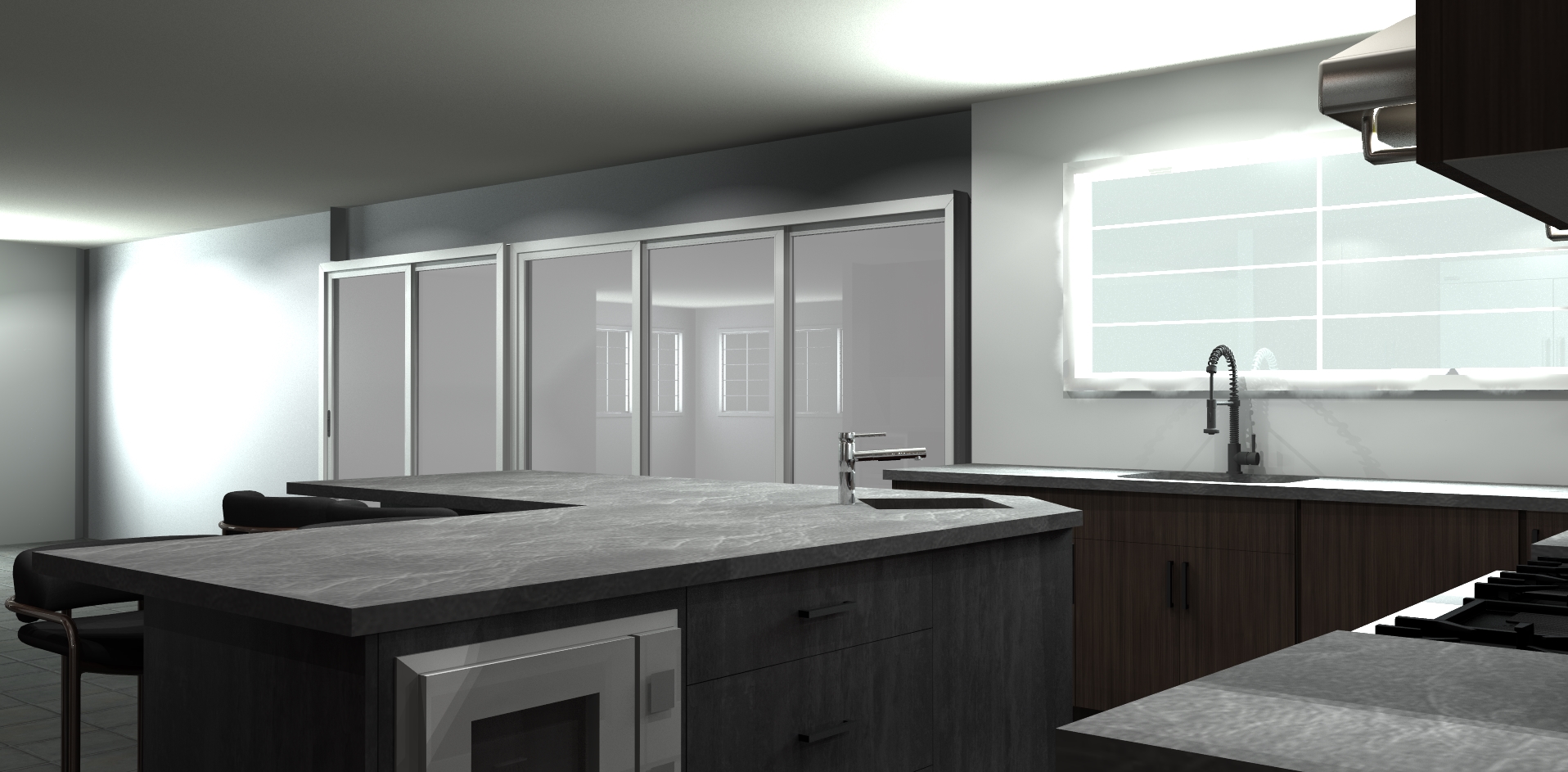 maintain original structure but give the render an industrial luxury loft vibe add concrete full height backsplash
