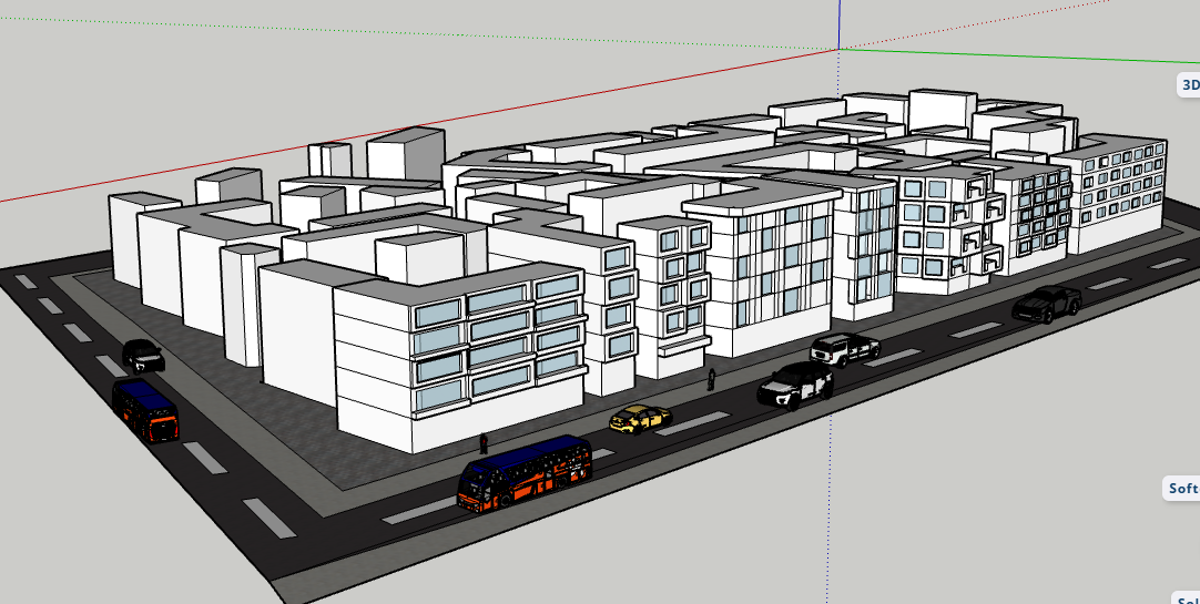 render a modern urban landscape featuring a series of sleek contemporary buildings use a mix of clean white and light grey for the building exteriors with large glass windows reflecting the sky add subtle blue and silver highlights for a futuristic touch the road should be a deep charcoal grey with white lane markings place modern vehicles in black silver and vibrant red on the road to add dynamism the scene is set in a bright clear daytime atmosphere with a soft warm sunlight casting gentle shadows one way lane for transport plant trees on sidewalk as well
