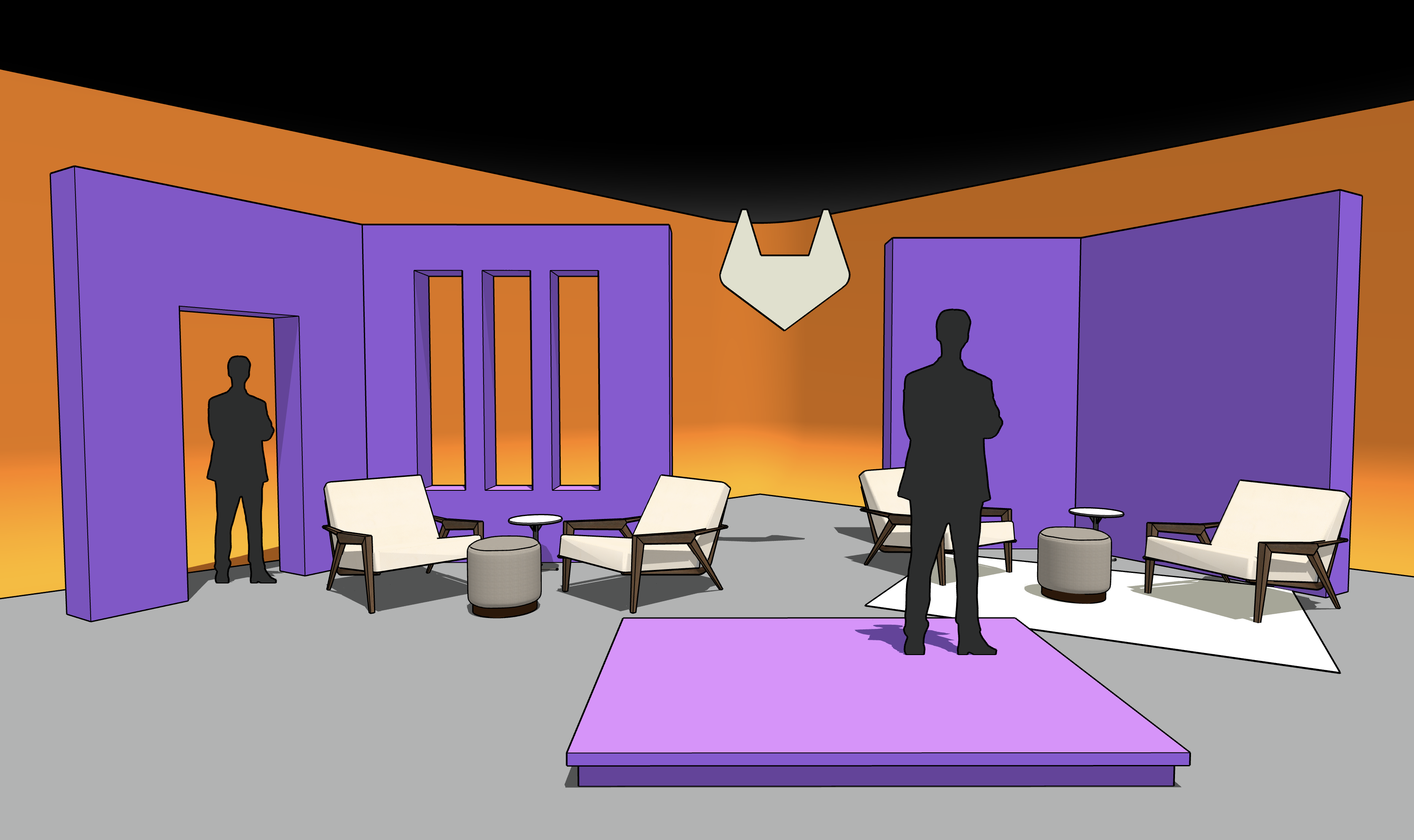 we are looking at a beautiful rendering of a stage set for a film shoot with orange light on the back cyc wall dramatic lighting