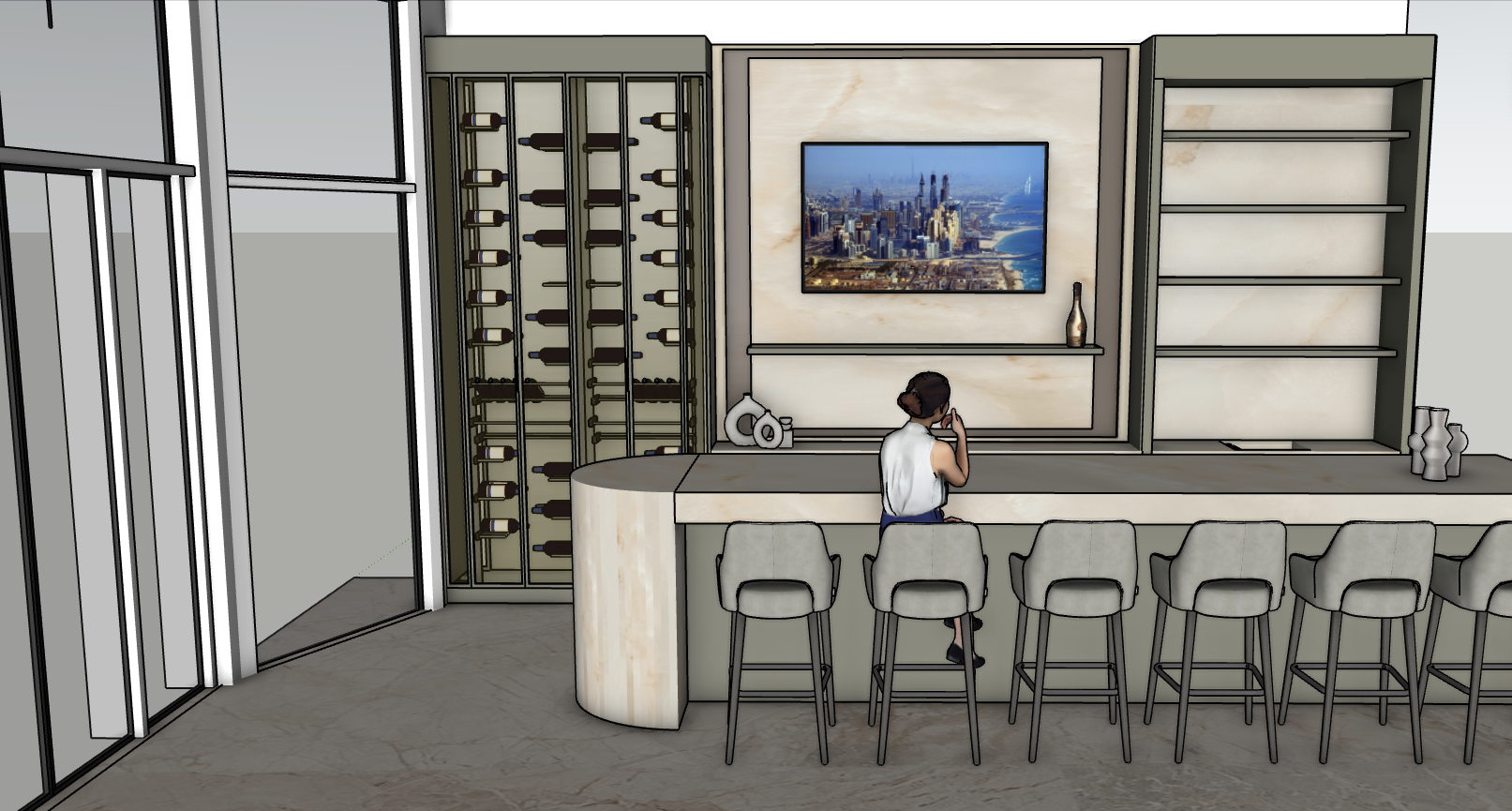 photorealistic interior render of a luxury bar a high end villa in miami with floor to ceiling glass windows overlooking palm trees and ocean views interior design features elegant marble countertops polished brass details dark wood cabinetry and velvet seating warm ambient lighting combined with natural tropical daylight ing through large windows bottles and glassware highly detailed realistic reflections and refractions soft shadows global illumination ray traced lighting cinematic composition shot with 35mm lens shallow depth of field ultra detailed textures pbr materials 8k resolution v ray corona renderer style hyper realistic natural color grading slight imperfections luxury atmosphere not change materials and shape