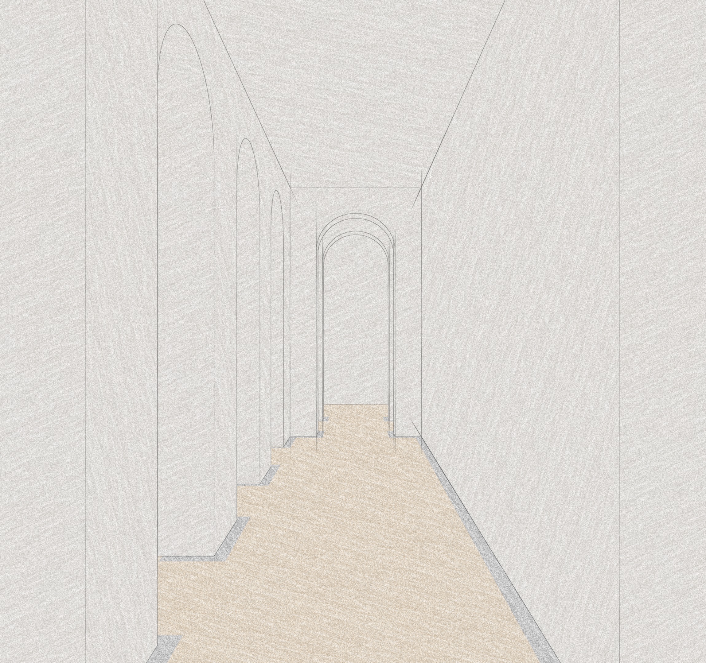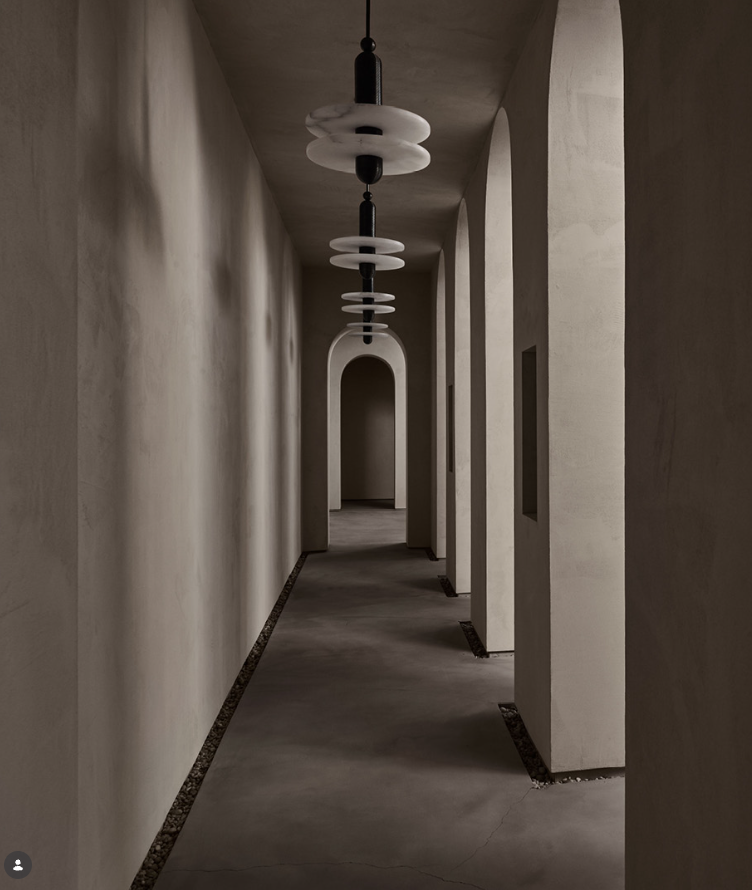 exterior shot keep exact corridor geometry camera position proportions and arch rhythm unchanged maintain the same sequence of arches and pendant lights transform materiality to a dark high end spa atmosphere inspired by japanese minimalism walls smooth dark plaster or microcement in deep charcoal graphite matte finish subtle texture floor large format dark stone slabs with minimal joints slightly reflective wet look base edges replace gravel with clean shadow reveal or recessed drainage slot ceiling darker tone seamless minimal texture lighting remove bright white lighting introduce soft indirect low level lighting very subtle cool daylight entering from the end of the corridor add faint reflections on floor as if slightly humid optional very light mist haze for atmosphere mood calm immersive high contrast spa environment no warm yellow tones keep neutral to cool balance emphasize depth shadow and silence do not change geometry scale or composition only modify materials lighting and atmosphere