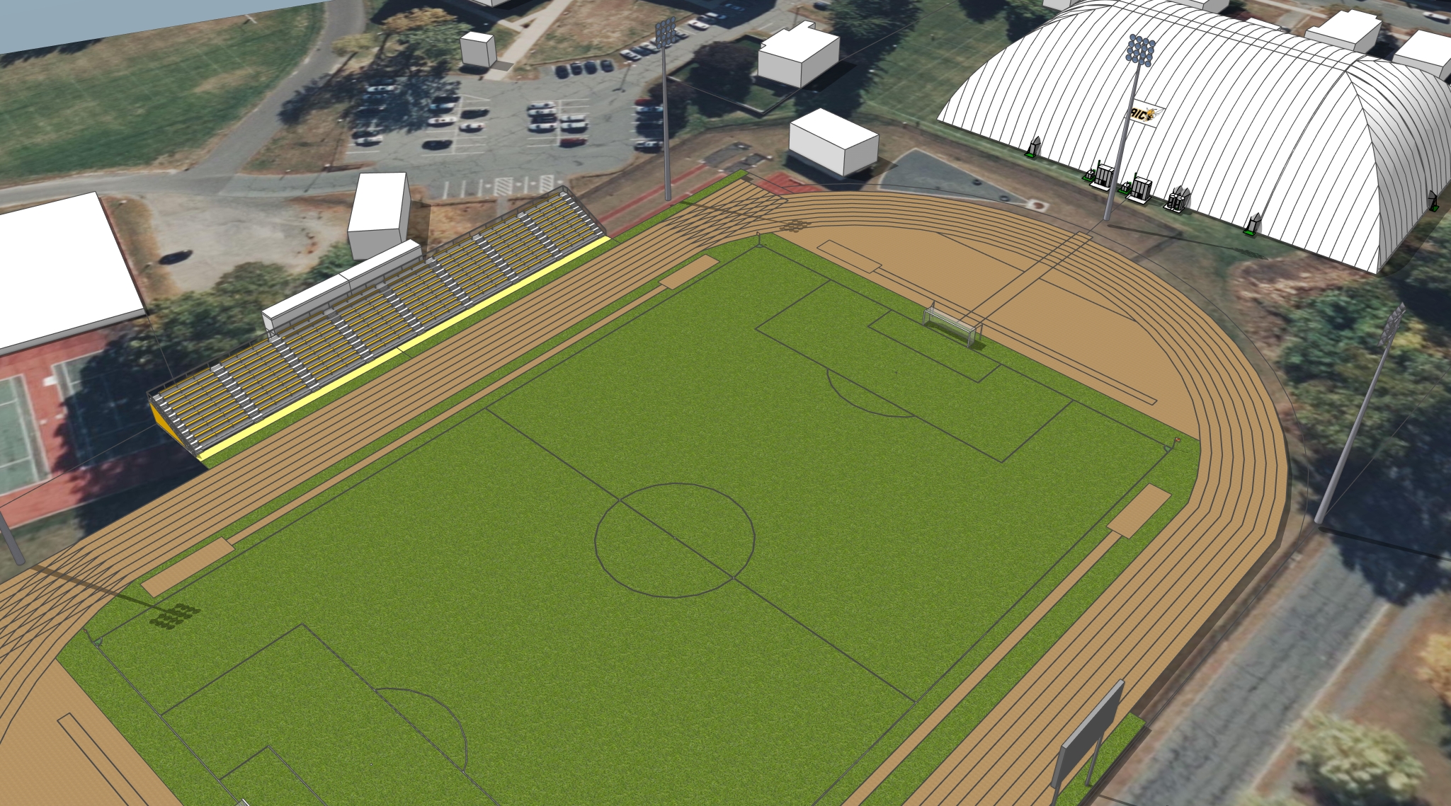 render a vibrant aerial view of a sports facility the soccer field should have lush green grass with crisp white boundary lines the surrounding track is a deep earthy brown complemented by rich wooden textures on the benches the stadium seats are a bright yellow with sleek silver railings the dome structure uses a smooth white metallic finish reflecting soft ambient light the parking lot features clear asphalt with crisp white lines and nearby trees should be depicted with a blend of deep greens and natural browns capture the scene under a serene clear blue sky with soft sunlight cascading across the landscape creating a warm and inviting atmosphere
