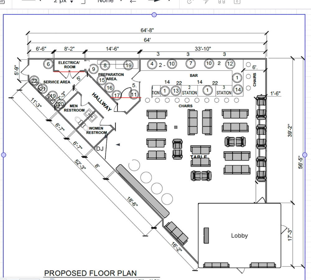create a 3d model for this floor plan it is a bar you are going to see some red lines that is supposed to be walls please close those spaces its called silque cocktails so very upscale vibe luxury lighting is gonna be chandeliers hanging furniture very classic luxury in the entrance you are going to see a lobby we want the entrance to feel mysterious