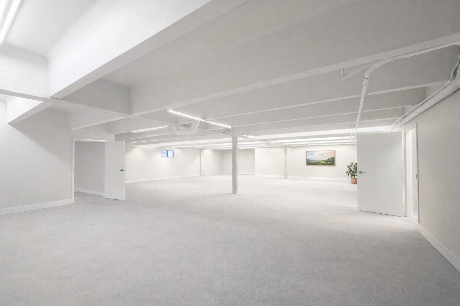 convert this to a pilates reformer studio try to fit at least 18 reformer machines and convert the room on the left to a change room and shower no need to show exactly inside but have labels make the atmosphere very chic and luxury using warm colours suitable for trendy pilates studios have a small smoothie bar at the very back on the left where there is an in depth corner add a few people to the photo to make it alive put mirrors on the side wall on the right close the door on the right architecture