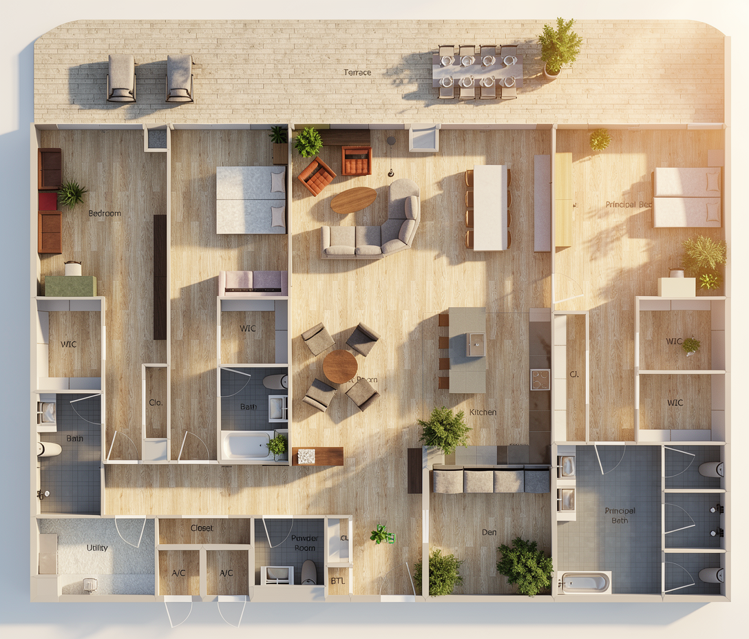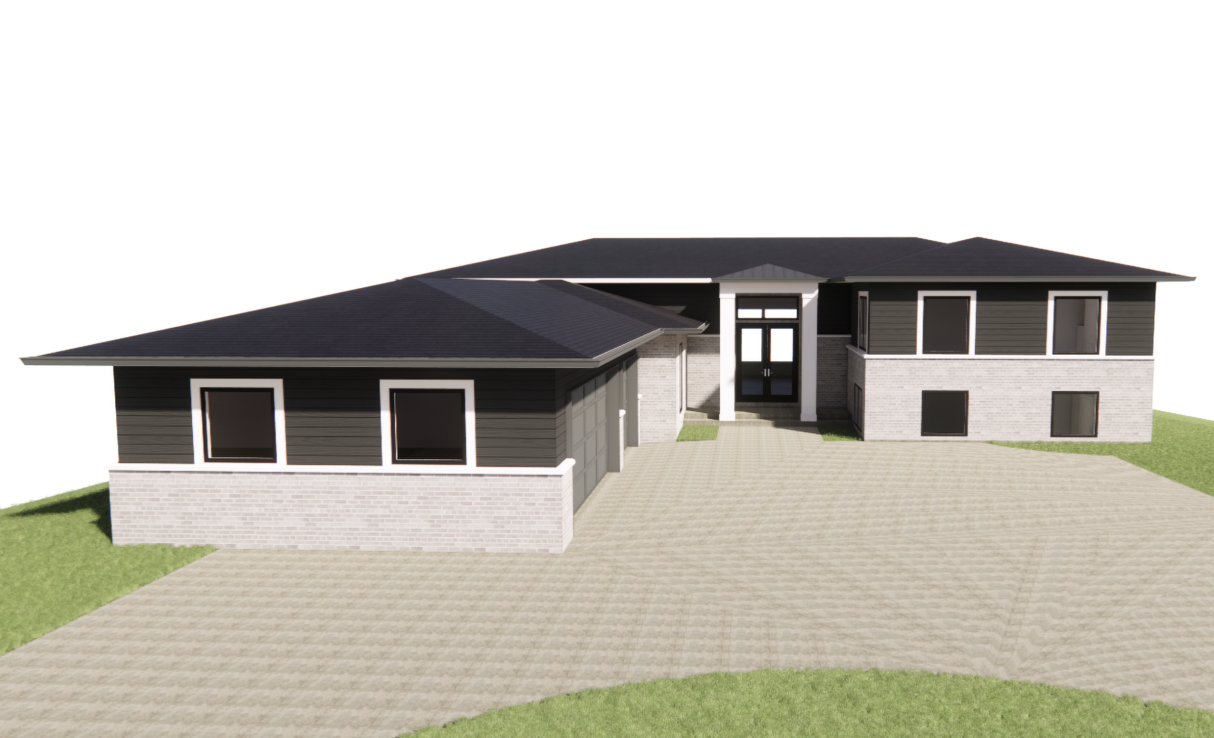 render a modern elegant lakefront home exterior the overall color palette should feature off whites and soft greiges or tans for the main exterior surfaces to create a bright and airy feel windows should be black the roof should be gray shingled incorporate limestone columns the front facade should include a large double glass front entry door designed to be the focal point the garage door should be modern black with glass on the side the siding should be a balanced mix of light tan brick and smooth white lap siding highlight clean lines and minimalistic forms add landscaping with mature trees white hydrangea bushes and boxwoods