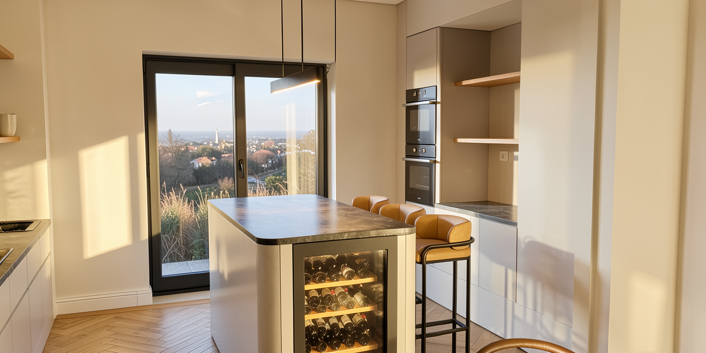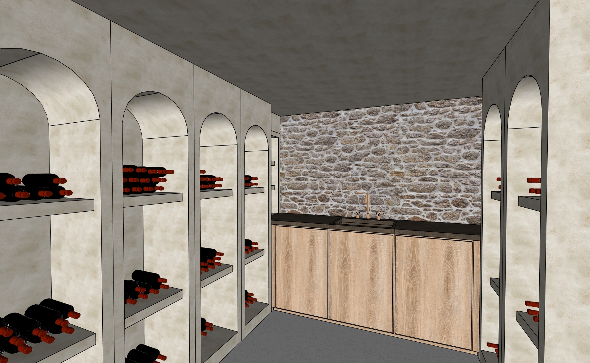 a photorealistic architectural rendering of the same elegant wine cellar interior maintaining the exact same materials and architectural language as the previous view the space features soft beige lime plaster walls and a perfectly flat straight ceiling finished in the same lime plaster creating a seamless continuous mineral surface the floor is finished in smooth grey beige polished concrete with a slightly lighter tone to create a softer and more luminous atmosphere along the back wall the same rustic natural stone wall as in the previous view is reproduced with identical texture color and irregular stacked stone pattern ensuring visual continuity the decorative pebbles on the floor are removed and the wooden cabinet below the stone wall is extended fully down to the floor creating a clean continuous base with the same warm natural wood material and dark stone countertop a small integrated sink remains centered on the counter maintaining the minimal and refined preparation area arched wall niches continue along both sides displaying wine bottles stored horizontally preserving the original layout and architectural rhythm the niches are softly backlit with led lighting to illuminate the bottles and emphasize the depth of the alcoves the lighting is warm and atmospheric with only two discreet recessed ceiling spotlights centered on the ceiling illuminating the space the scene emphasizes material realism soft shadows subtle reflections global illumination and high end architectural photography quality while maintaining the exact same design language proportions and materials as the previous wine cellar view