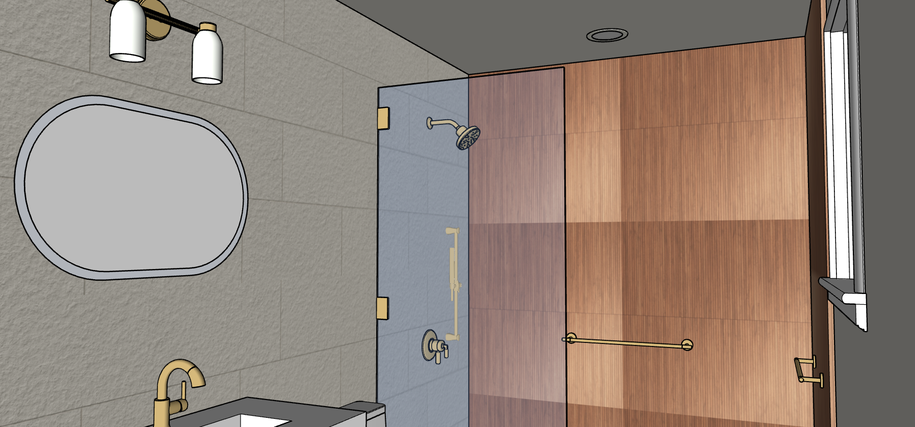 mirror with white glass edge thin vertical 3d wood slat tiles in shower light scones have no shine vanity light scones are matte white glass turn vanity light and ceiling recessed light on at 3000k