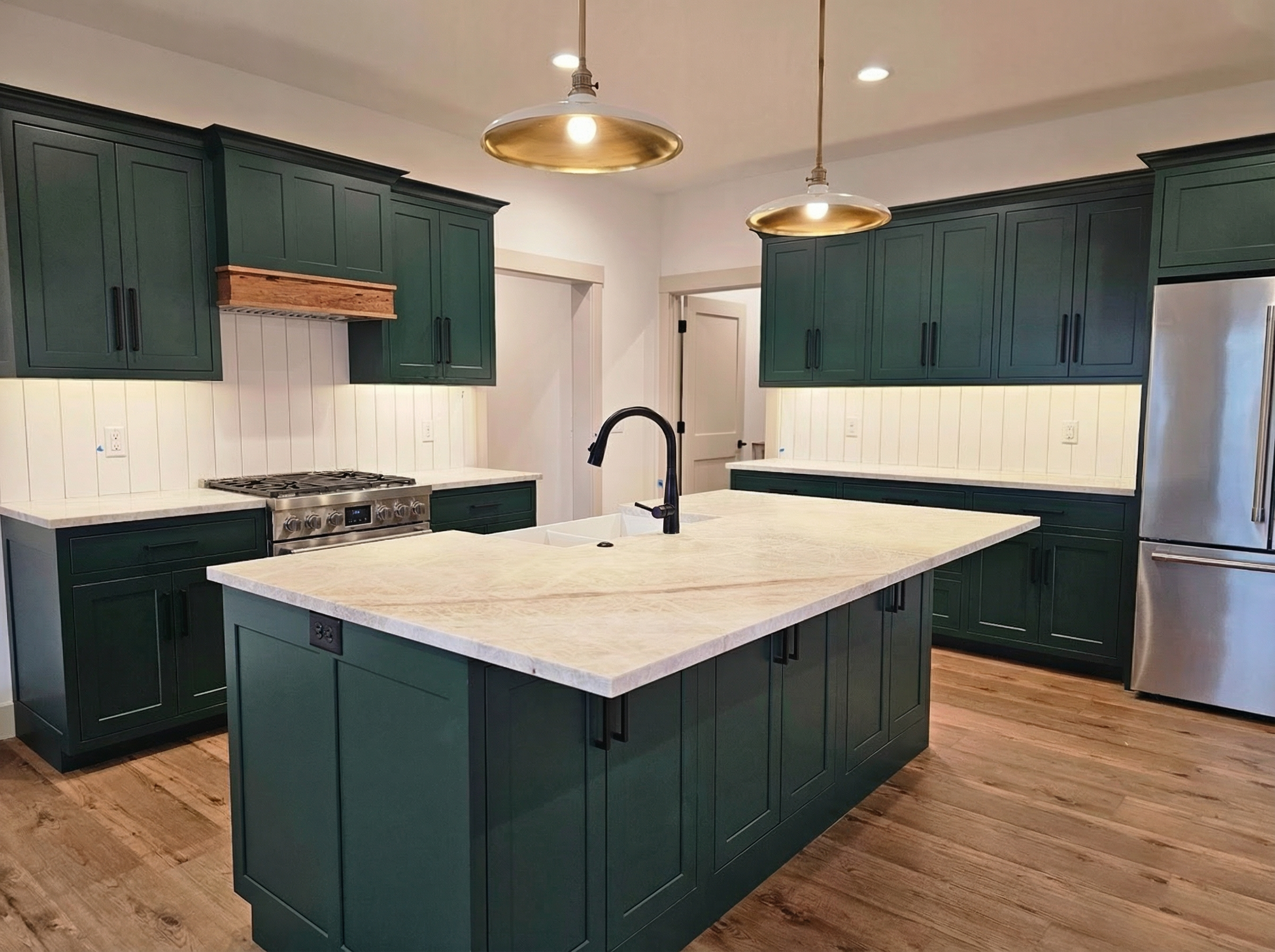 crea un render fotorealistico di questa vista si tratta di una sala da pranzo le pareti sono colore beige con boiserie il pavimento in parquet a spina italiana colore caldo al centro della stanza c un grande tavolo ne vediamo solo una met lungo il lato lungo perch il punto di vista appena sopra al tavolo la luce arriva dalla destra dove c una finestra che non visibile nella vista la stanza che si vede oltre la porta una cucina utilizza gli stessi materiali dell immagine di riferimento induzione nera isola in marmo grigio con venature bianche mobili sul retro grigio beige e pavimento in gres effetto terrazzo moderno
