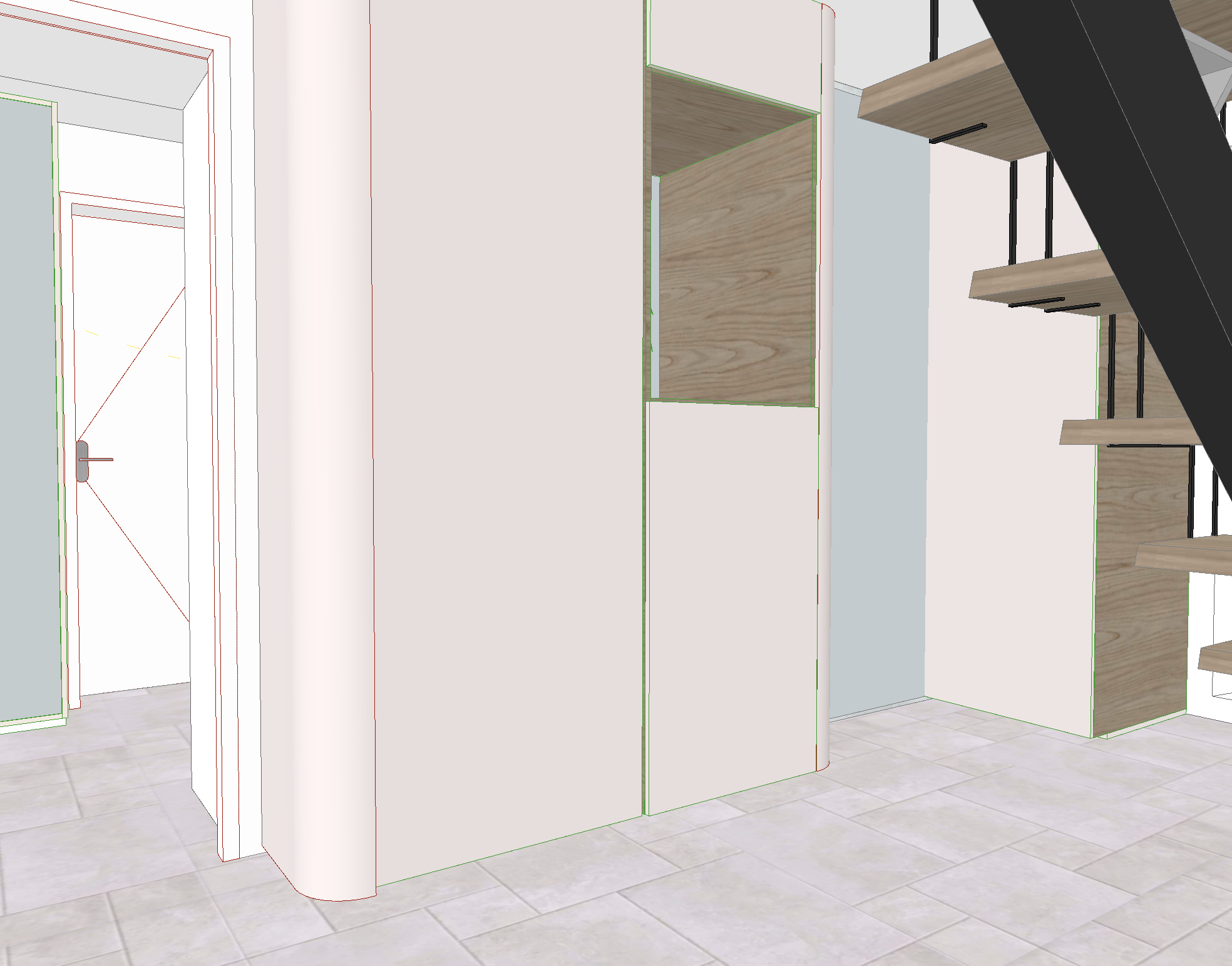 render a modern indoor scene with a staircase and a door the floating steps are wooden with a warm oak finish contrasted by sleek black metal supports the wall is off white giving a japandi and minimalist feel the door is a soft white with subtle geometric red outlines featuring a modern silver handle the right wall is covered in a textured dark wood with green highlights adding depth and interest the floor has light gray stone tiles with a slight sheen for a polished contemporary look the atmosphere is bright and airy with soft natural lighting creating gentle shadows