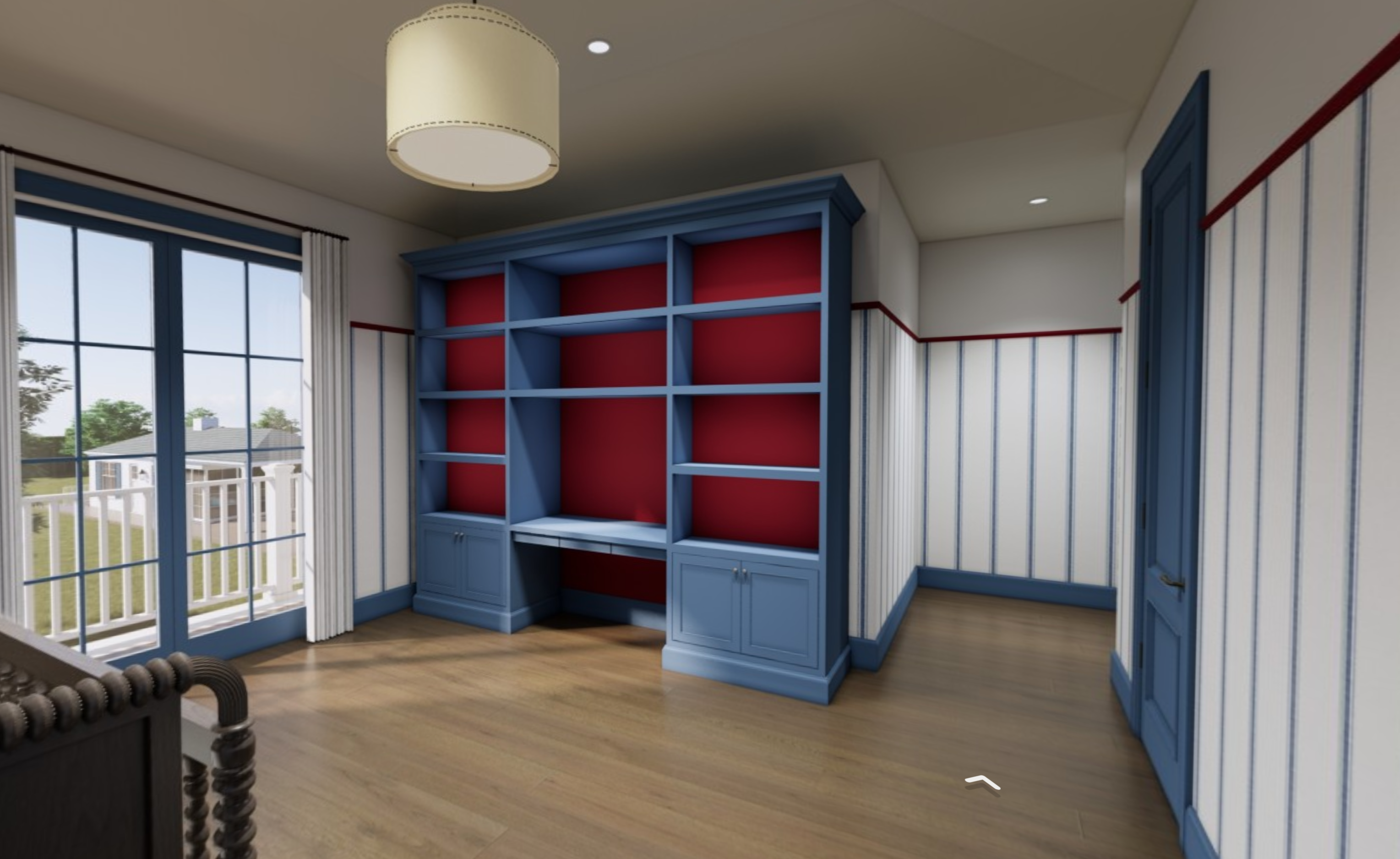 keep the design but boost this to a more realistic rendering including adding books and objects on the shelves