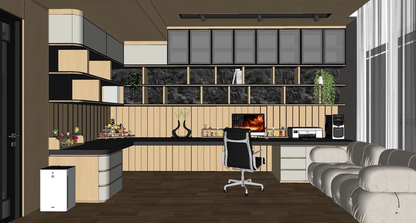 create an ultra realistic image without changing any of the structure shape design or materials dont resize the jpeg use soft wood texture for the floor don t change the color material or shape add spotlights to the ceiling add indirect light to shelves and add some decorations use light soft wood for the ceiling add indirect light to curtain valance