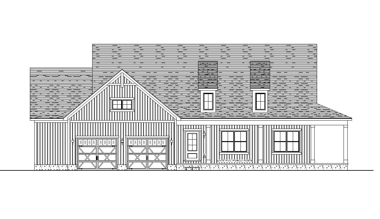 make as photorealistic as possible while keeping textures the same as selection professional landscaping in a lightly wooded scene with good lighting match materials to plan sage color vertical siding white trim and corner boards white porch posts black soffit fascia gutters downspouts black windows white window trim white garage doors driftwood roof no stone remove text