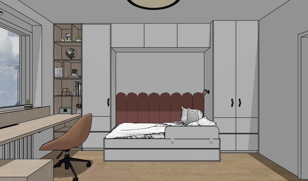 render an elegant bedroom interior featuring a minimalist design use soft gray for the walls and ceiling providing a calming atmosphere the custom wooden shelves and desk should be in a light oak finish adding warmth incorporate a comfortable chair in a muted brown tone the bed features a unique headboard in a rich burgundy color paired with a cozy white comforter and pillows adorned with subtle patterns add a touch of greenery on the shelves the wardrobe should have sleek gray panels with dark leather handles complementing the modern aesthetic enhance the space with ample natural light coming through the window casting gentle shadows and creating an inviting and peaceful ambiance