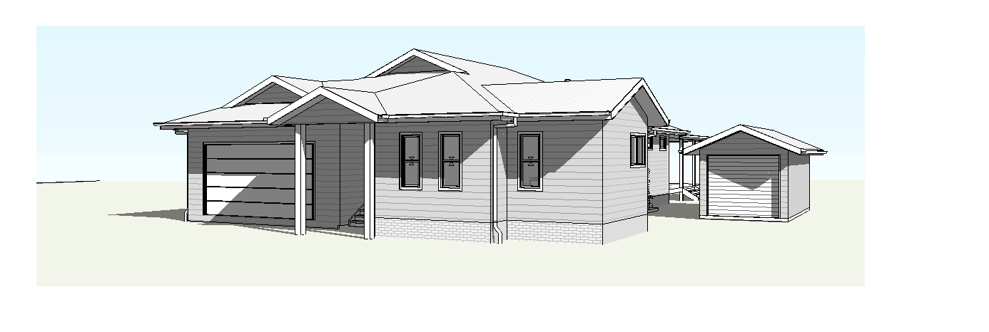contemporary beach style light colour scheme with white roof and very pale grey blue walls add lush green lawn low landscaping around front of house driveway leading to garage door on the left and path leading to front door between the 2 front posts show car in driveway