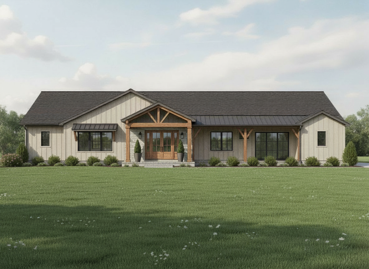 render a photorealistic 3d perspective of this house in a slovakia modern minimalist house with a sleek white facade the upper floor has a softly warm gray structured striped plaster large wood windows with grey outdoor blinds the foreground features a lush vibrant green lawn bordered by a variety of colorful plants enrich the atmosphere with blooming pink hydrangeas and soft purple flowers include elegant outdoor furniture on the porch in muted grey tones create a serene ambiance with a clouded sky and a backdrop of distant trees in soft green hues in backgound erase house and coloumn and insert a few trees make the landscape nicer vegetation detailed textures in the wood siding and glass reflections and a vibrant clear sky with light atmospheric depth render in hyper realistic architectural visualization quality 8k resolution