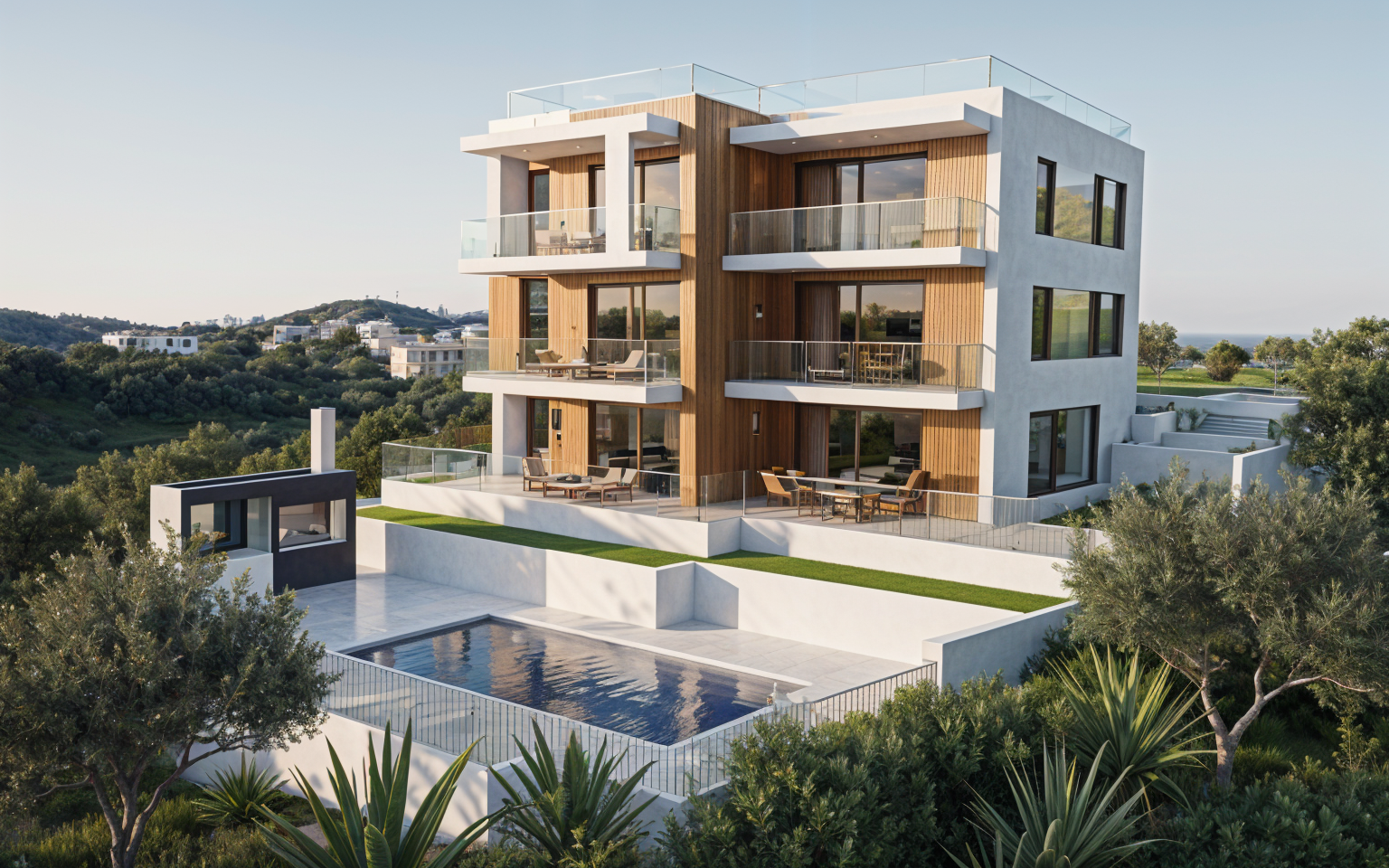 a modern building facade with a row of uniformly arranged windows each framed by black lines the building s structure is a mix of wood stucco and metal it is warm feeling welcoming and professional