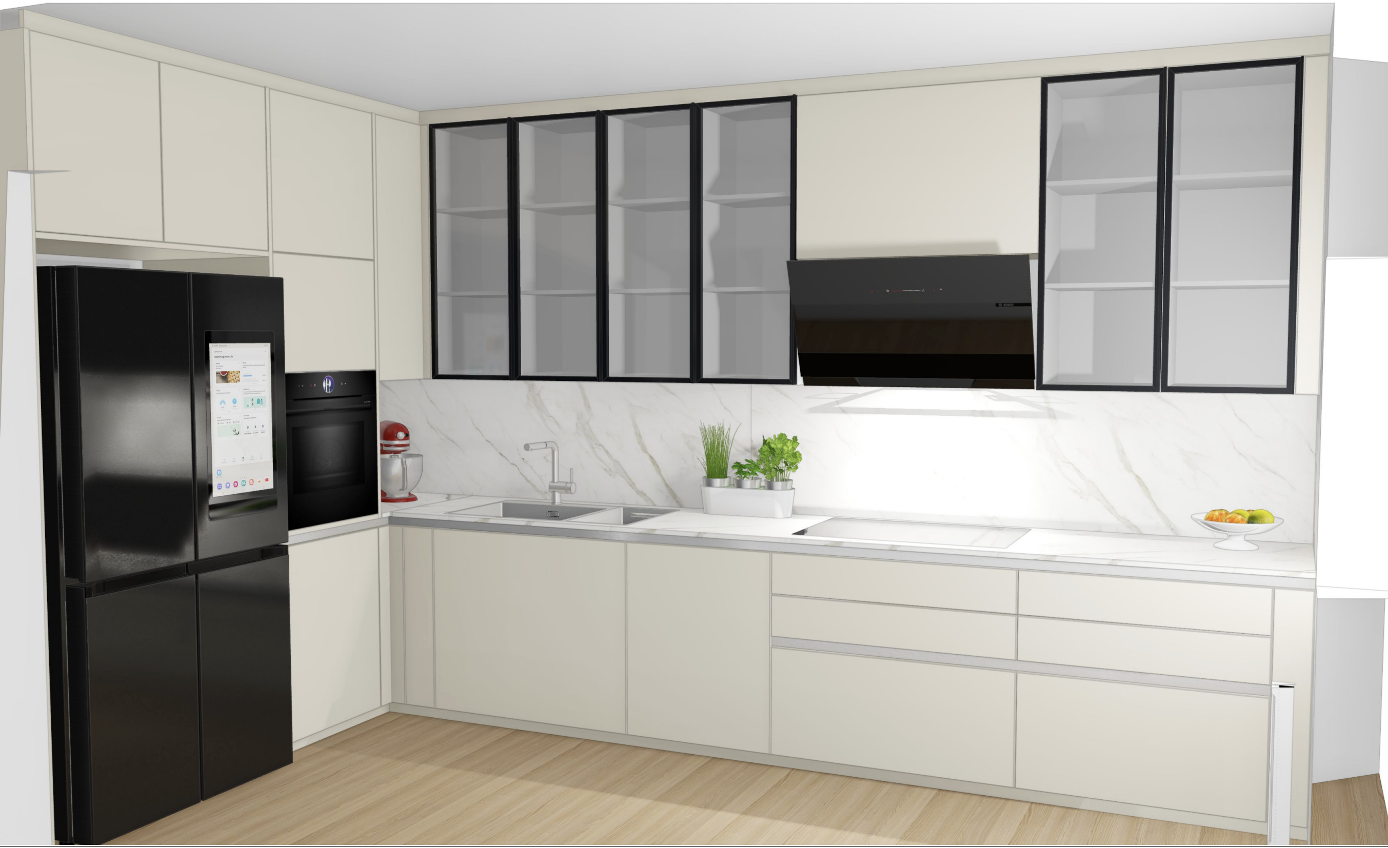 enhance the provided render into a photorealistic interior photograph while keeping all geometry layout objects proportions and styling exactly as they are do not add remove or change any elements only improve realism through physically accurate pbr materials micro details and natural lighting architecture
