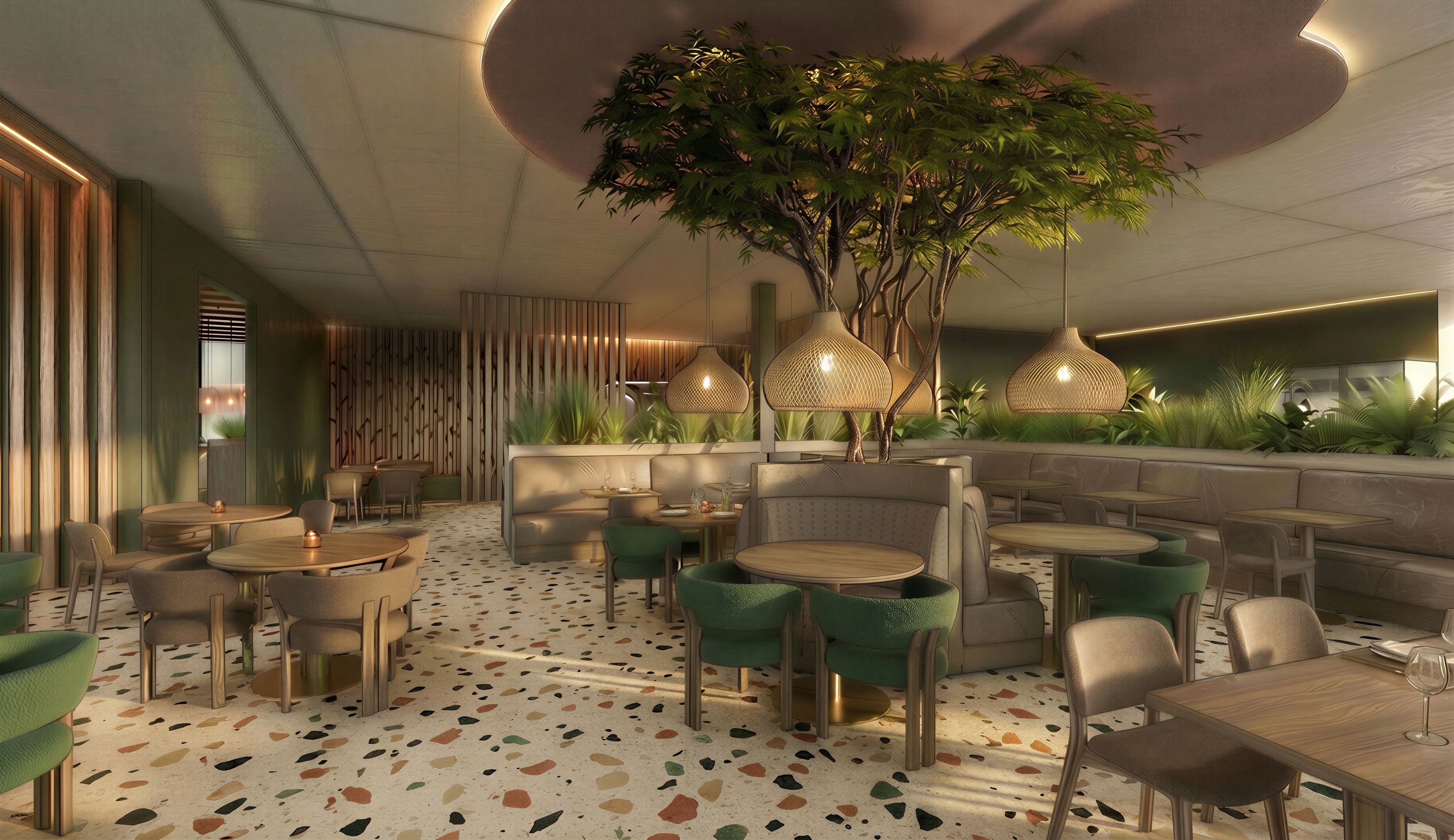 tafelbladen zijn walnoot hout ronde plafond panelen zijn bruin terra vilt