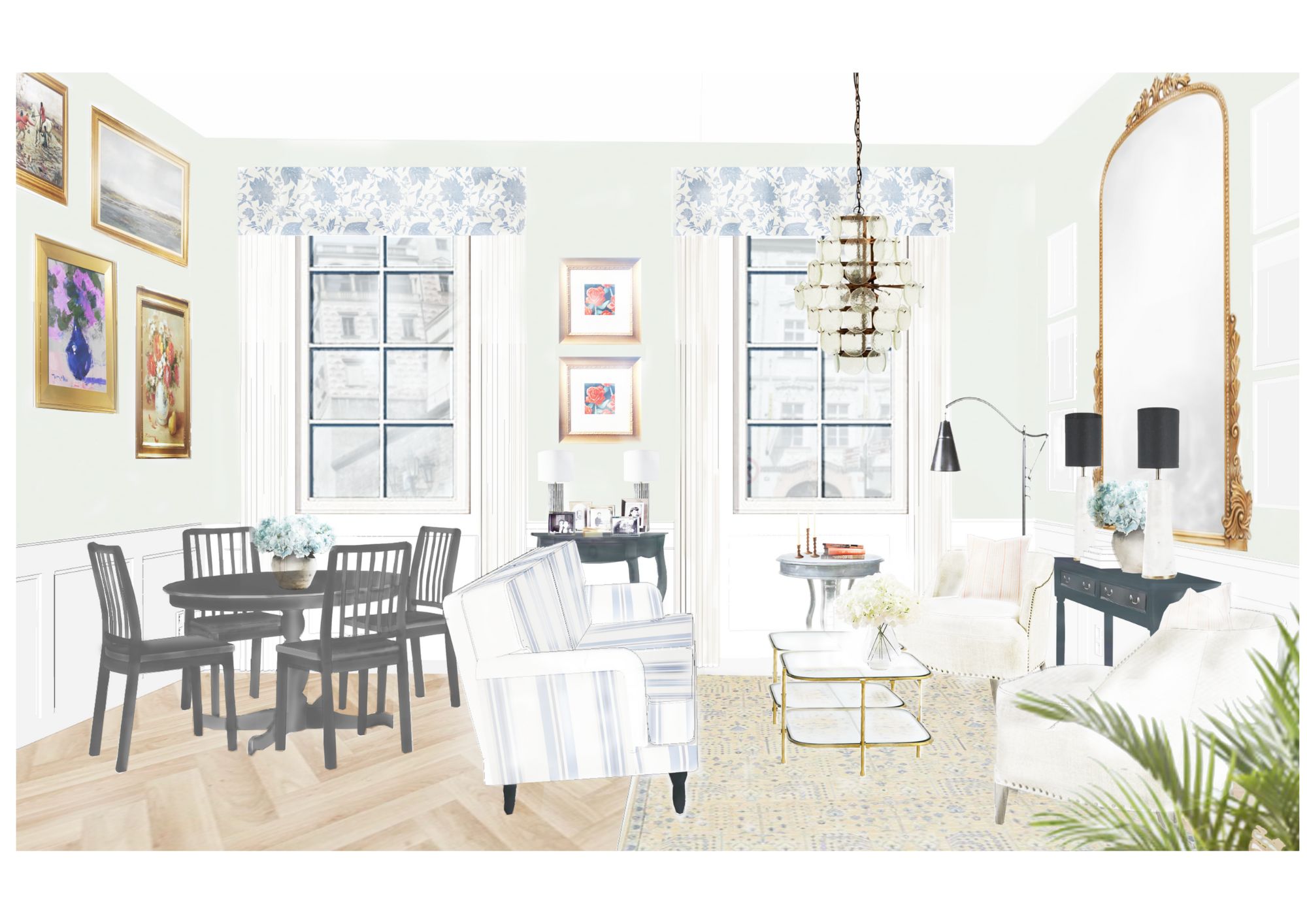 create a room filled with diffused light and a traditional couch but more crisp white blue fabric make the chairs from dusty blue linen add some pink pillows on the chairs