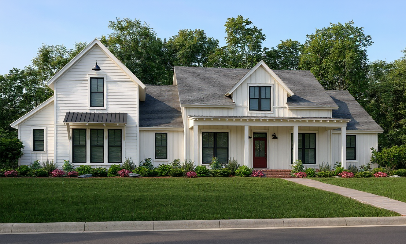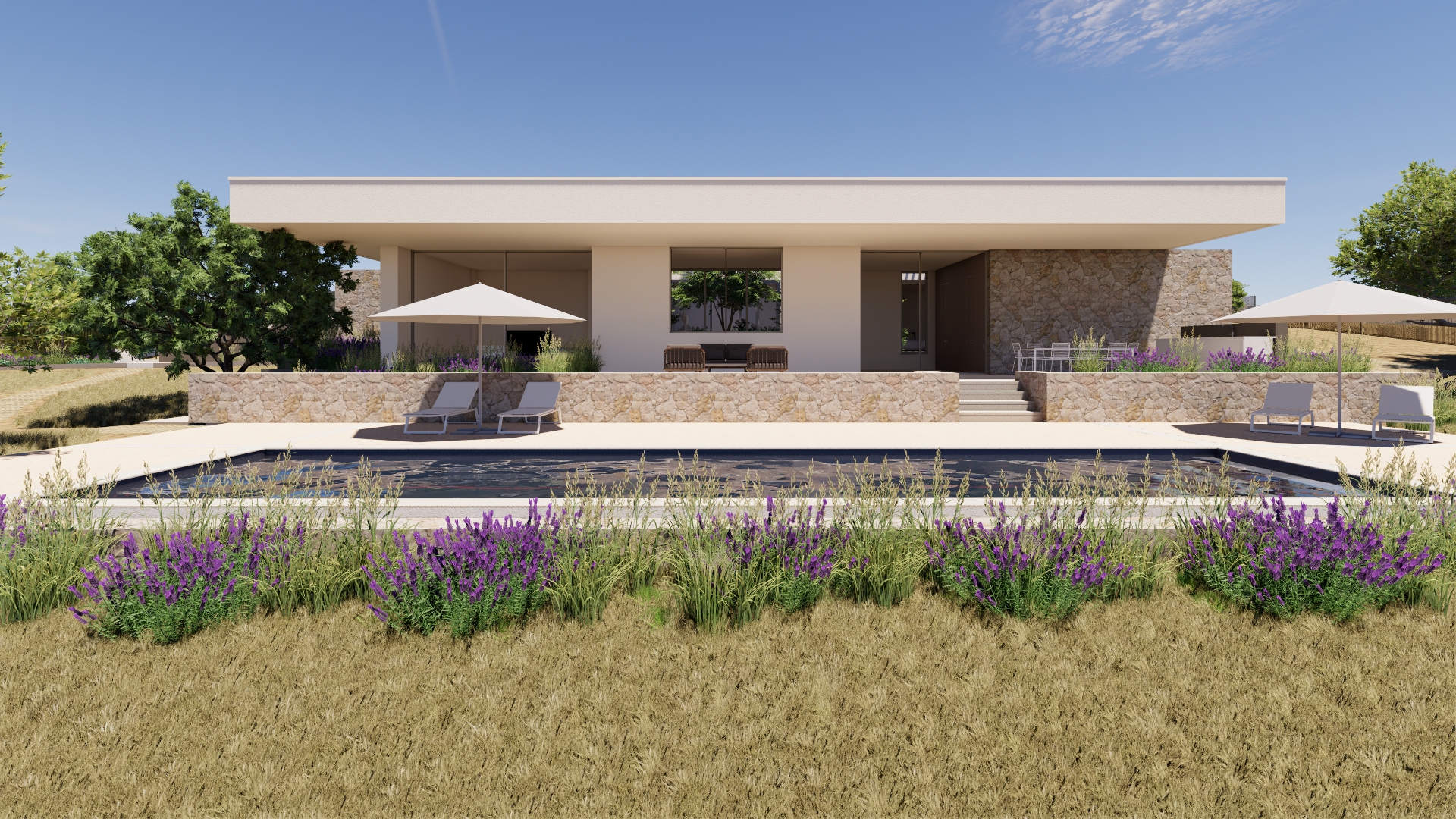 villa in an olive grove plot with many trees especially olive trees do not change the materials of the facade just add some outdoor furniture some bushes and flowers at the front of the swimming pool and make the image look more real in general architecture