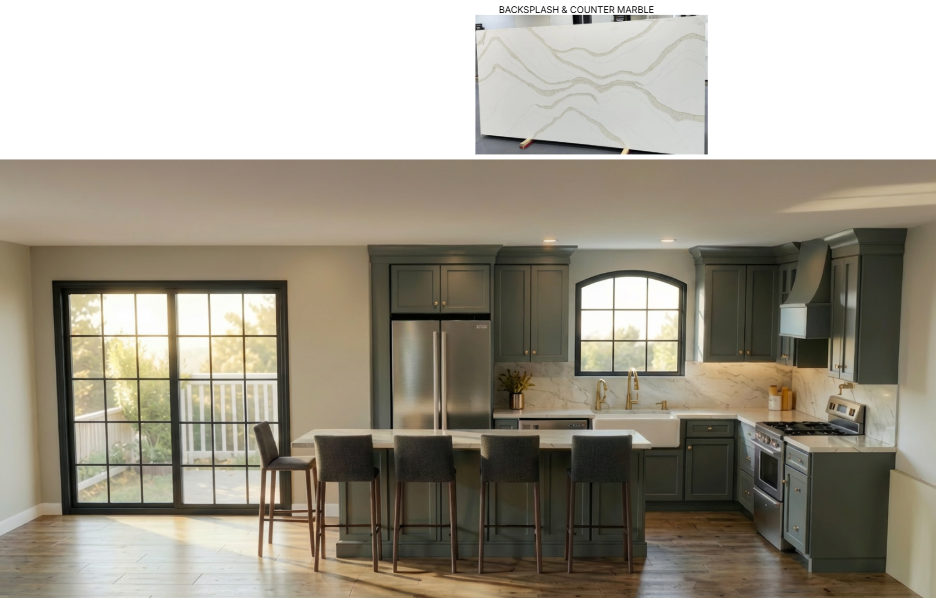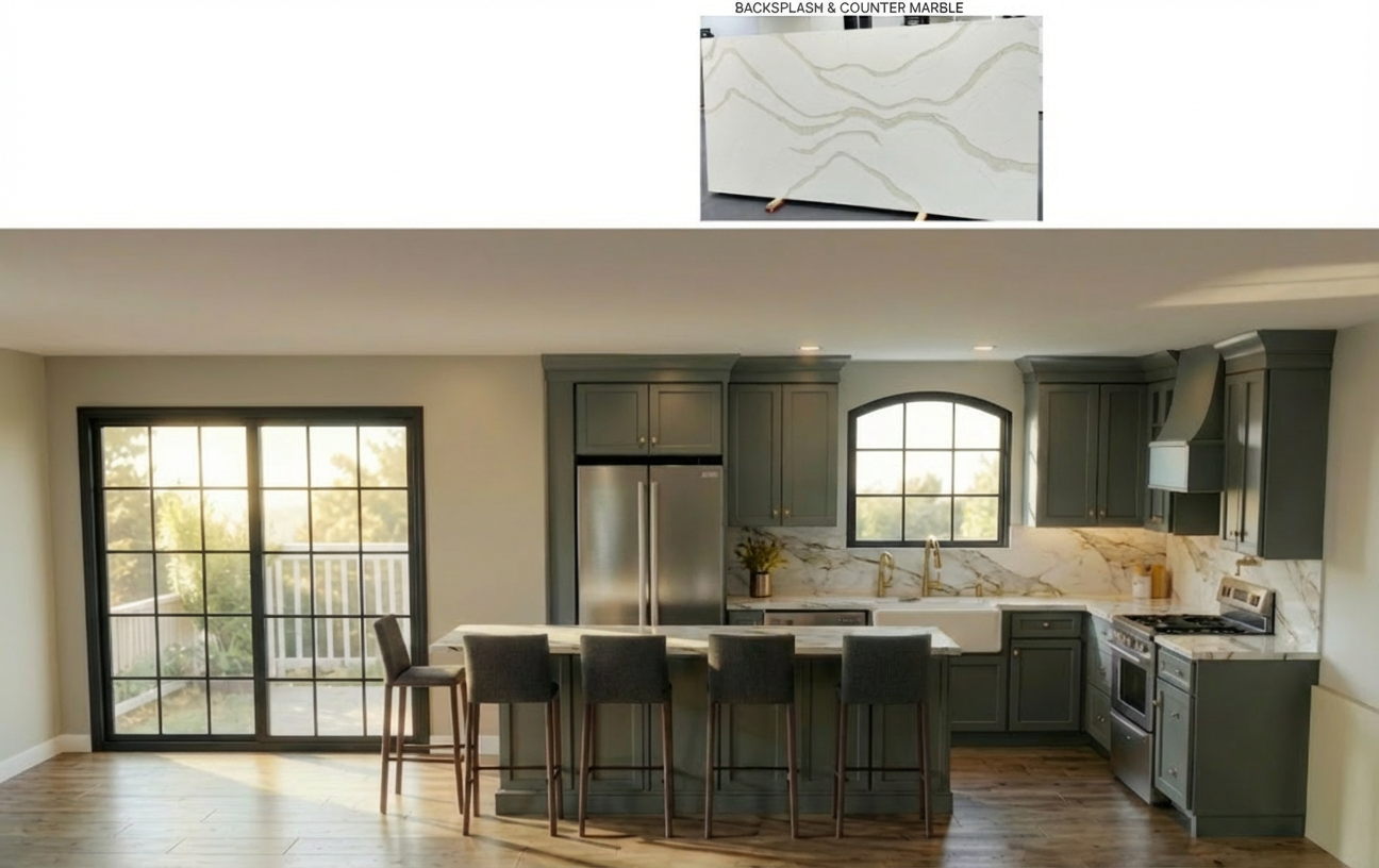 keep everything the same do not change color or materials only change the backsplash and countertop to the exact one referenced in the photo only change that to the exact photo of the marble shown do not change anything else or add anything just make this look like a realistic photo rendering