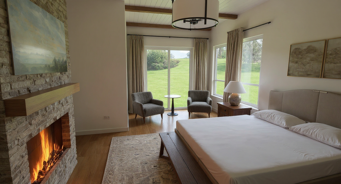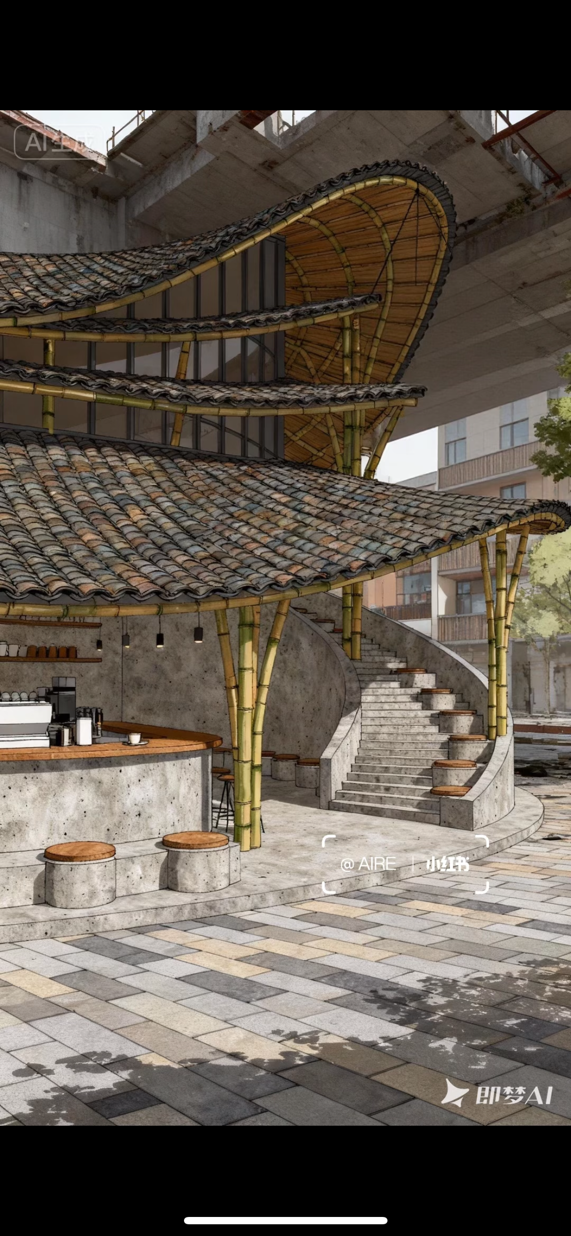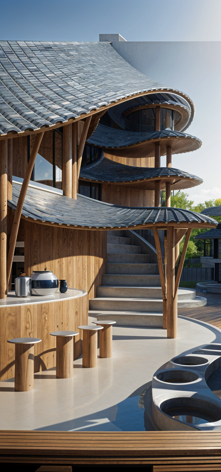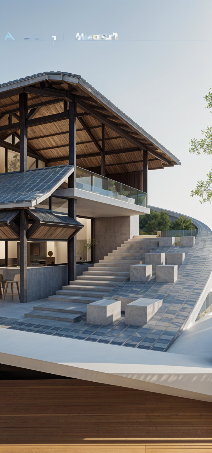 sarineen exterior shot render this to make it seem more realistic keep the materials as wooden and nature style make the roof very abstract looking with a chinese traditional architectural style add more open space area and void add more greenery architecture