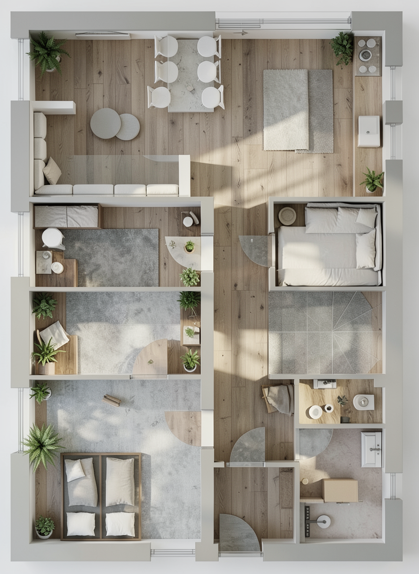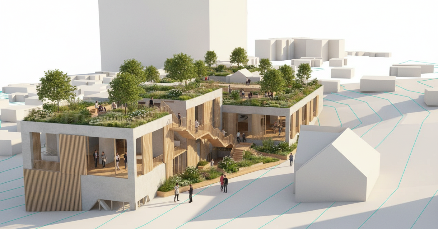 urban housing complex with multiple interconnected courtyards of different sizes and heights spatial hierarchy of shared spaces some intimate and enclosed others open and communal bridges and openings connecting volumes varied light conditions people gathering studying eating contemporary architecture with geometric openings inspired by steven holl simmons hall realistic architectural rendering