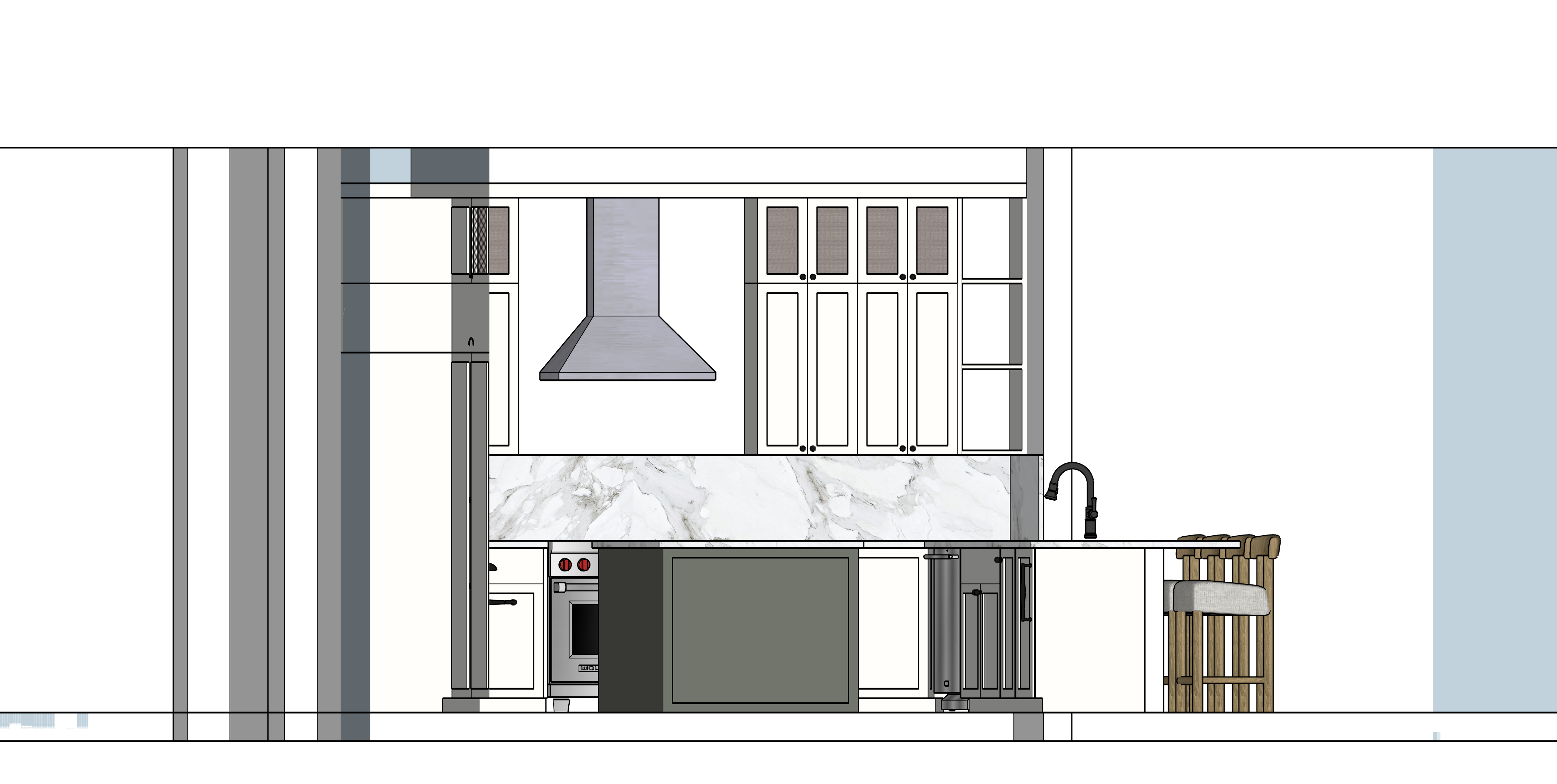 interior shot render a modern kitchen with a sleek and warm atmosphere featuring white cabinetry with black handles a stainless steel range hood a marbled white and gray backsplash and countertop matte black kitchen faucet olive green island a stainless steel oven with red knobs light wood barstools with gray cushions soft natural daylight