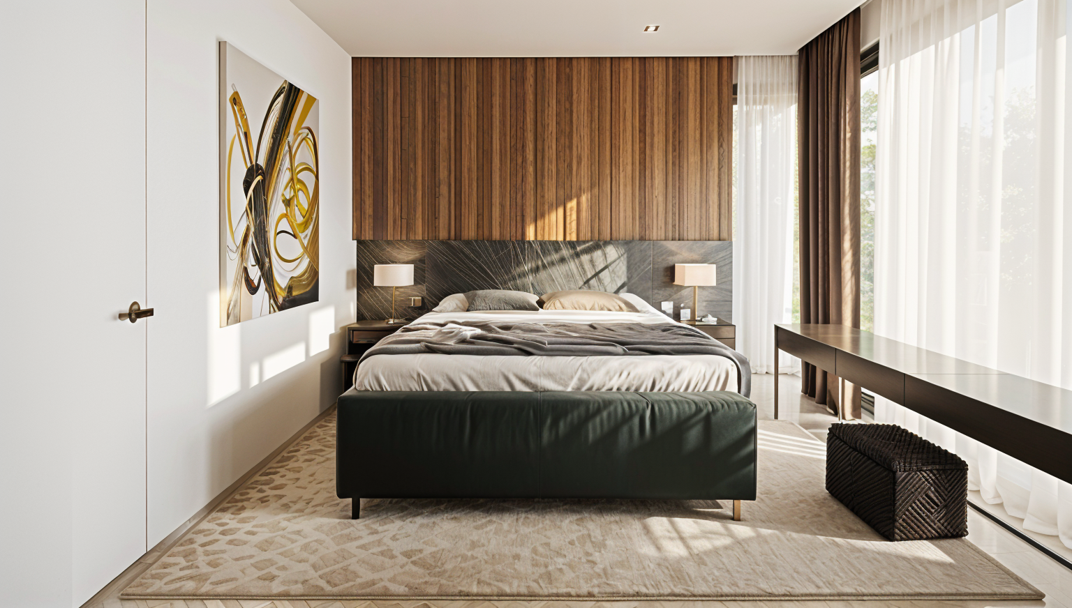 replace the current handles with tall slim vertical bar pulls featuring a slight angled or faceted inner edge creating a subtle v like profile between both handles the design should be minimalist with sharp clean lines and a refined metallic finish ensure both handles are perfectly aligned parallel and proportionate to the door height keep their position centered and consistent with the original layout do not redesign the doors or alter any other elements