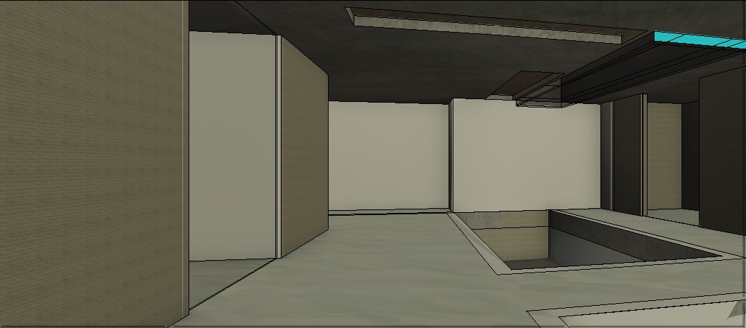 interior shot a high end residential basement spa designed as an immersive wellness retreat the space is defined by continuous onyx walls and floors creating a rich luminous atmosphere with a strong sense of material elegance on the right side the wellness sequence unfolds with a steam room open showers and a sauna connected by a generous 2 meter wide pathway that guides circulation through the space this axis leads to a large jacuzzi and an indoor swimming pool forming the heart of the spa experience above both the swimming pool and the jacuzzi the ceiling is formed by the underside of the outdoor infinity pool this allows natural light to filter through the water casting dynamic reflections and caustic patterns across the floor and walls below enhancing the sensory quality of the space the remaining open area is dedicated to relaxation featuring sunbeds and an intimate seating lounge at the far end of the room a recessed wall niche accommodates a refined bar for refreshing drinks completing the spa as a fully integrated luxury environment